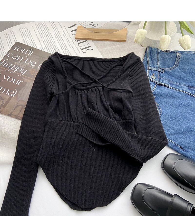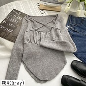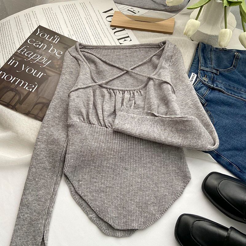 Nomikuma 不規則なクロスひだスクエアカラーセクシーなスリムニットトップス長袖女性 2023 春底入れプルオーバーセーター ロング スプリング 春物 スクウェア kor11586070355