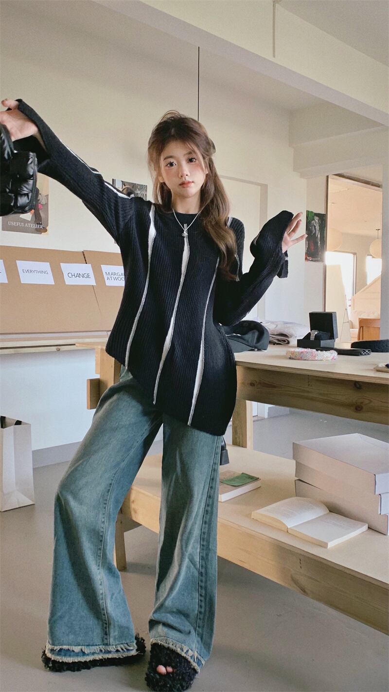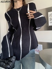 Nomikuma 不規則なストライプのセーターの女性の春のヒットカラースリムニットトップス 2023 長袖 O ネックニットプルオーバー ロング スプリング 春物 Oネック kor11101893898