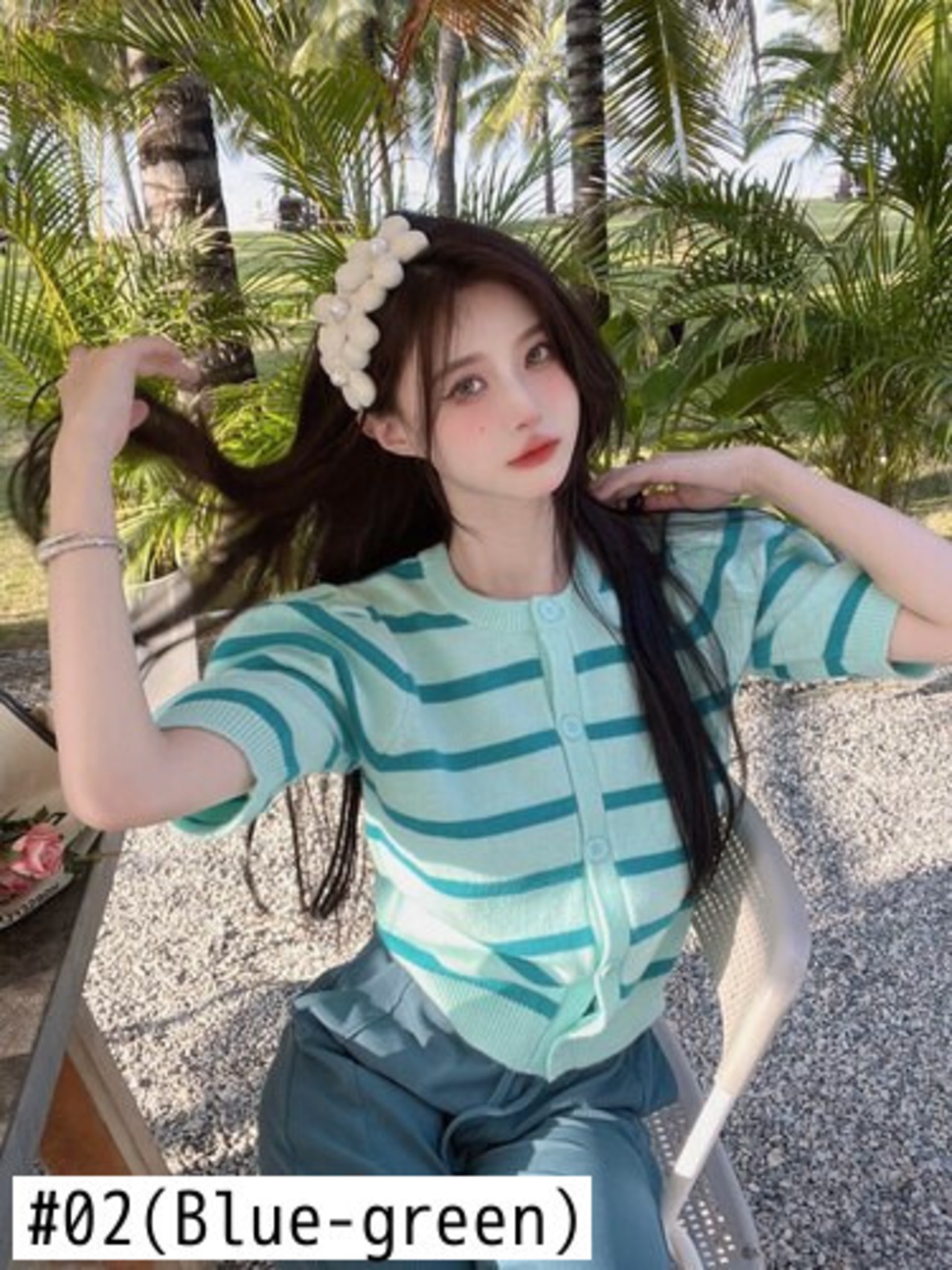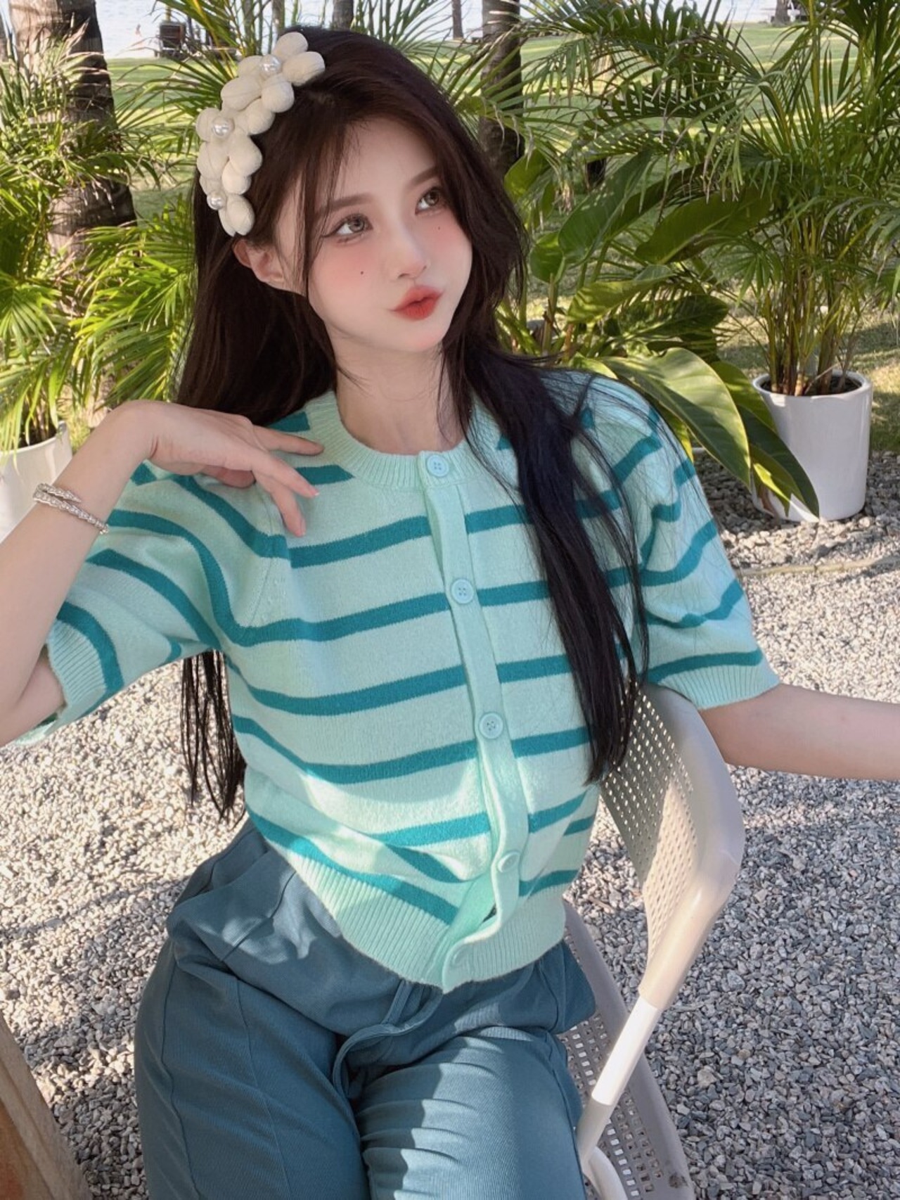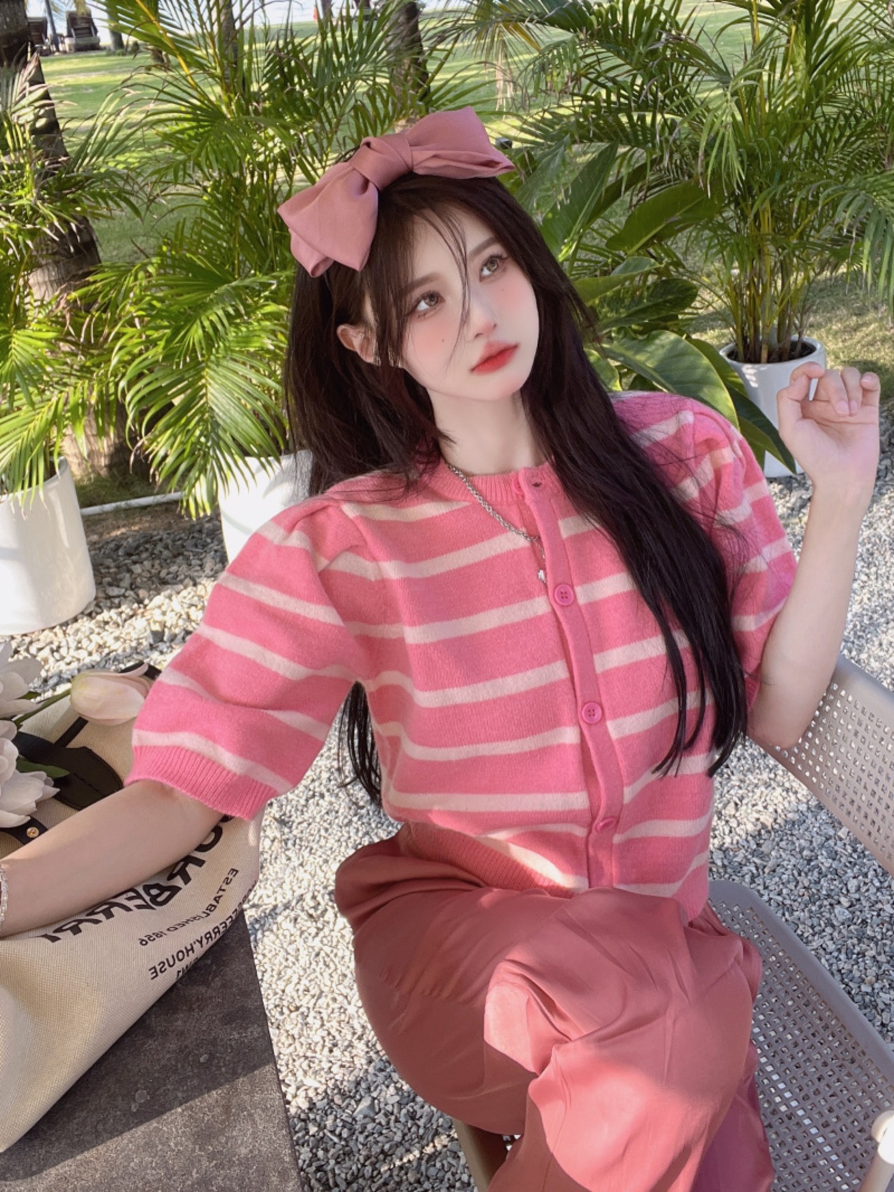 Nomikuma シックなパフ半袖ニットストライプカーディガン 2023 春夏セーターコート因果女性甘いニットトップス ショート ハーフスリーブ 大人ガーリー スウィート キュート カジュアル スプリング 春物 サマー 夏物 kor68846633803