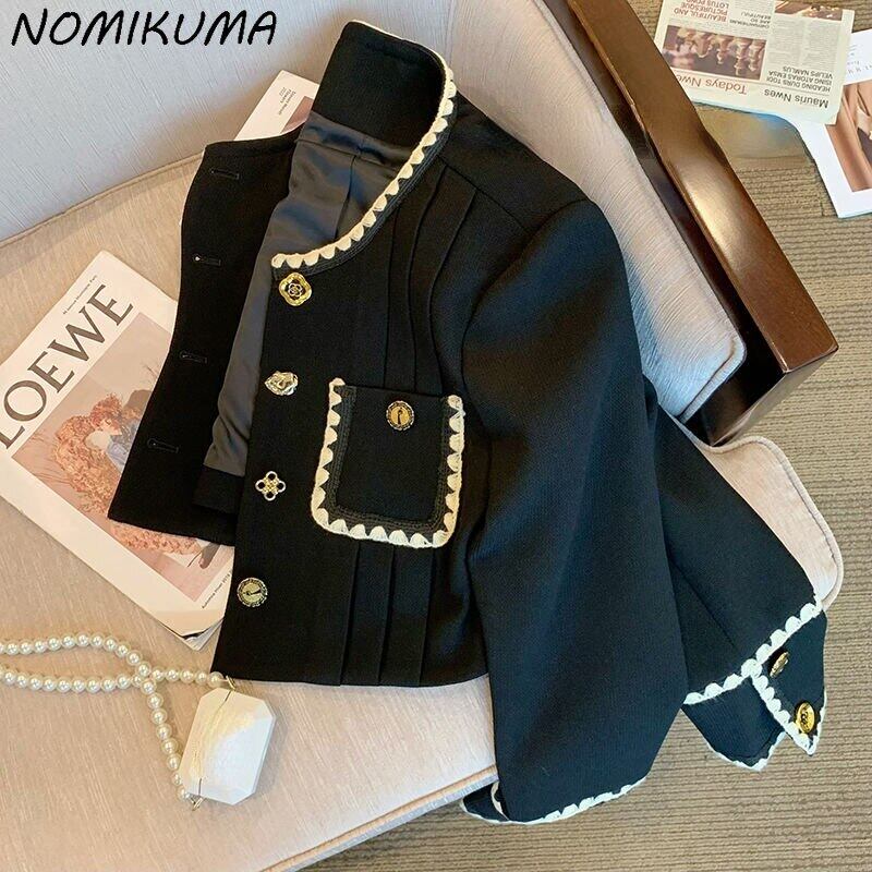 Nomikuma シックなヒットカラーショート女性コート長袖シングルブレスト O ネックジャケット 2023 春の生き抜くトップス ロング スプリング 春物 Oネック kor56236858747