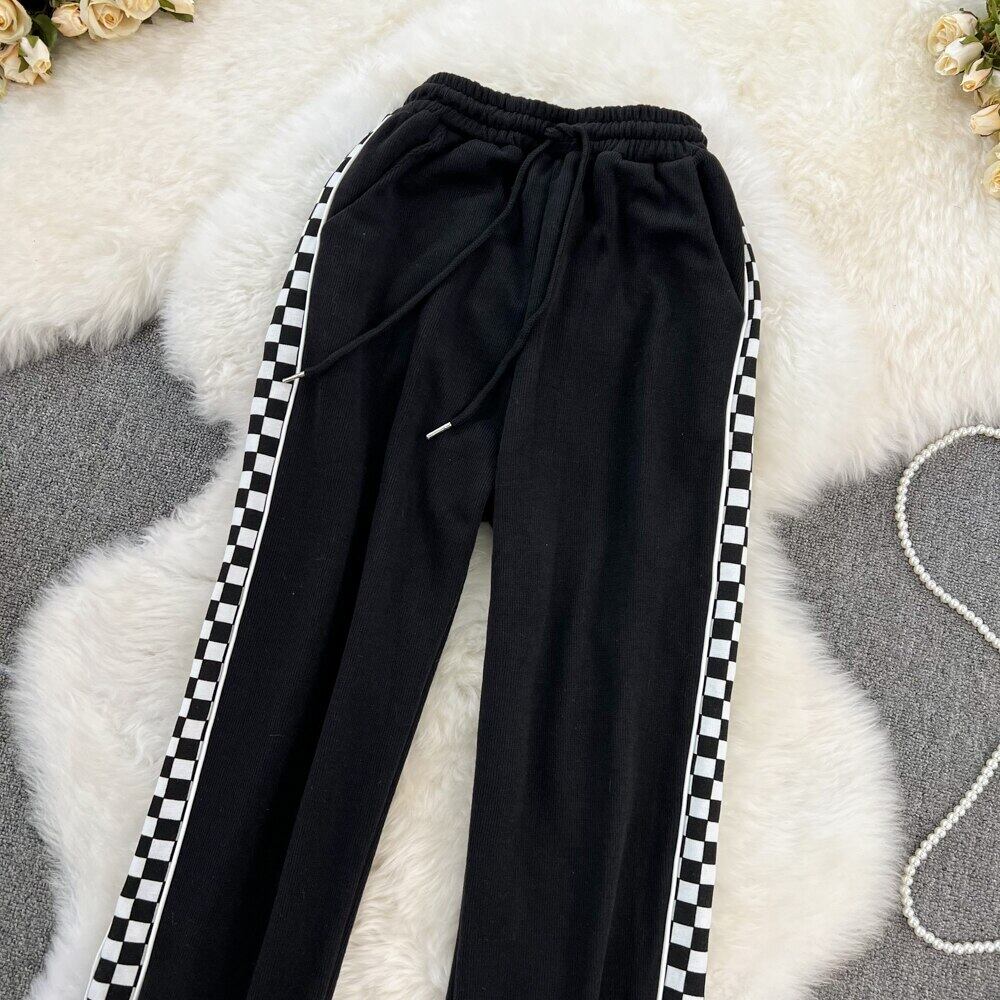 ノミクマ 春秋 レースアップ ウエストスウェットパンツ ヒットカラー チェック柄 長ズボン カジュアル ワイドレッグパンツ ロング スプリング 春物 オータム 秋物 ワイドパンツ kor29482606074