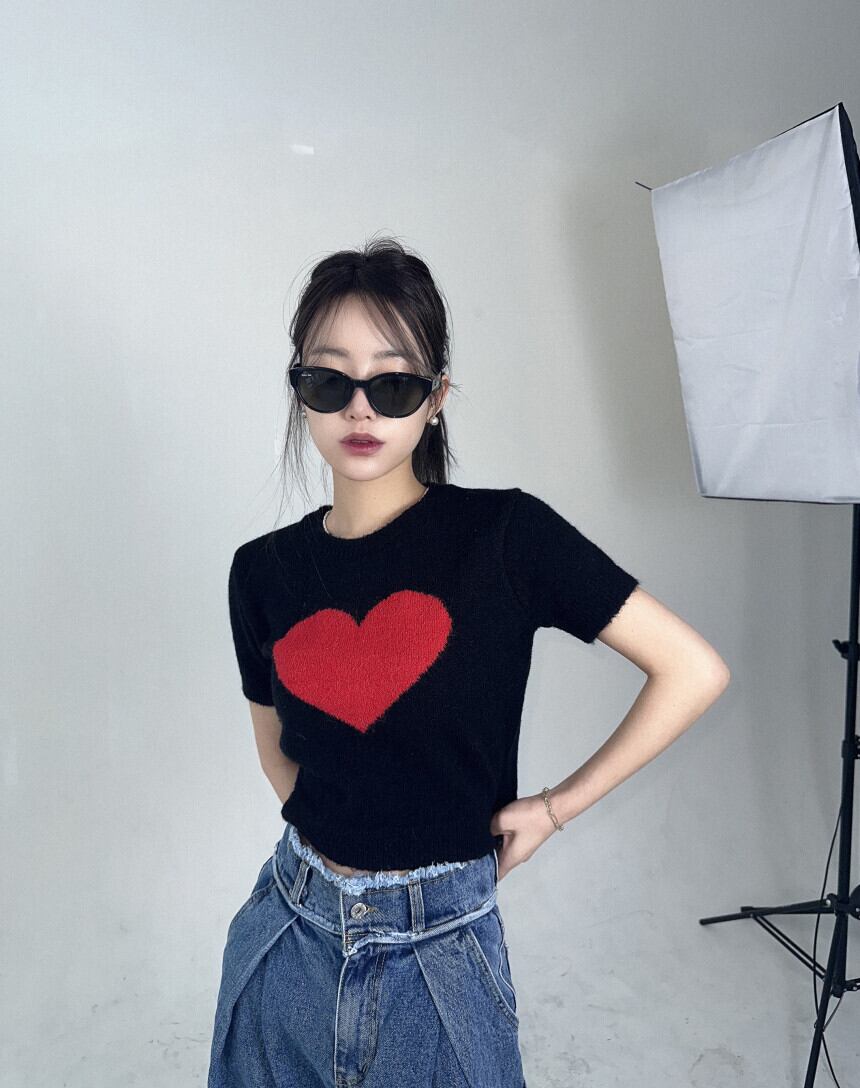 Nomikuma シックなラブハートスウィートショートニットトップス半袖 O ネック女性セーター春秋スウィートニット ハーフスリーブ 大人ガーリー キュート カジュアル スプリング 春物 オータム 秋物 Oネック kor38094965510
