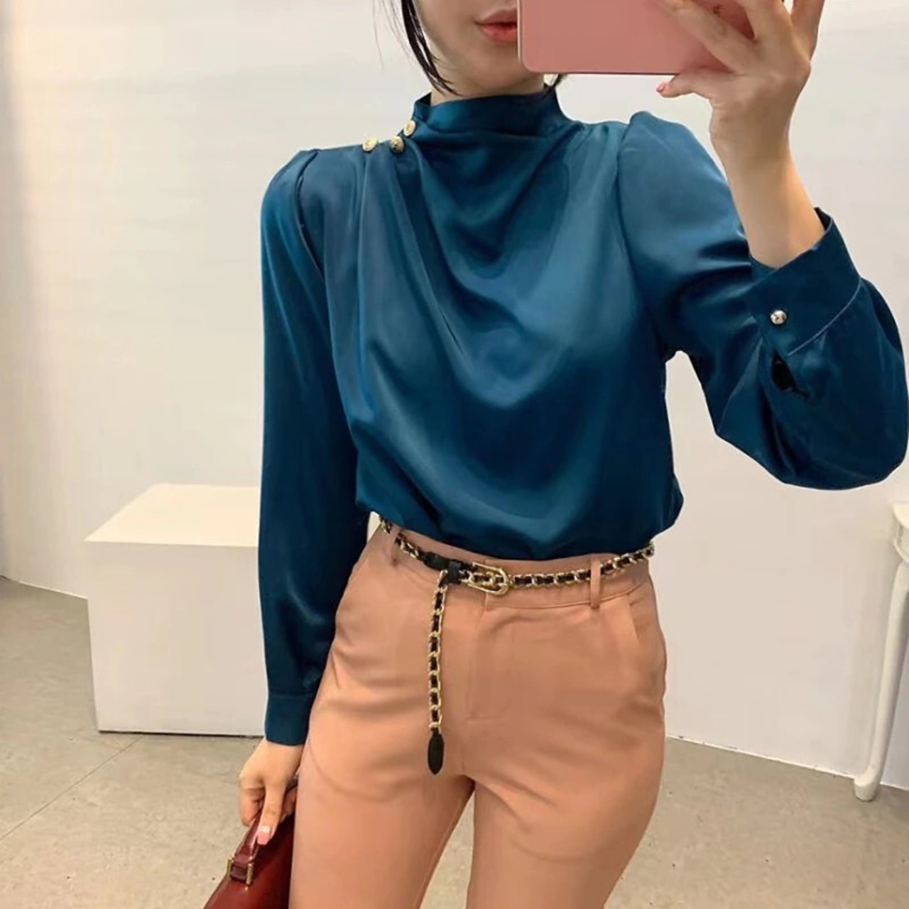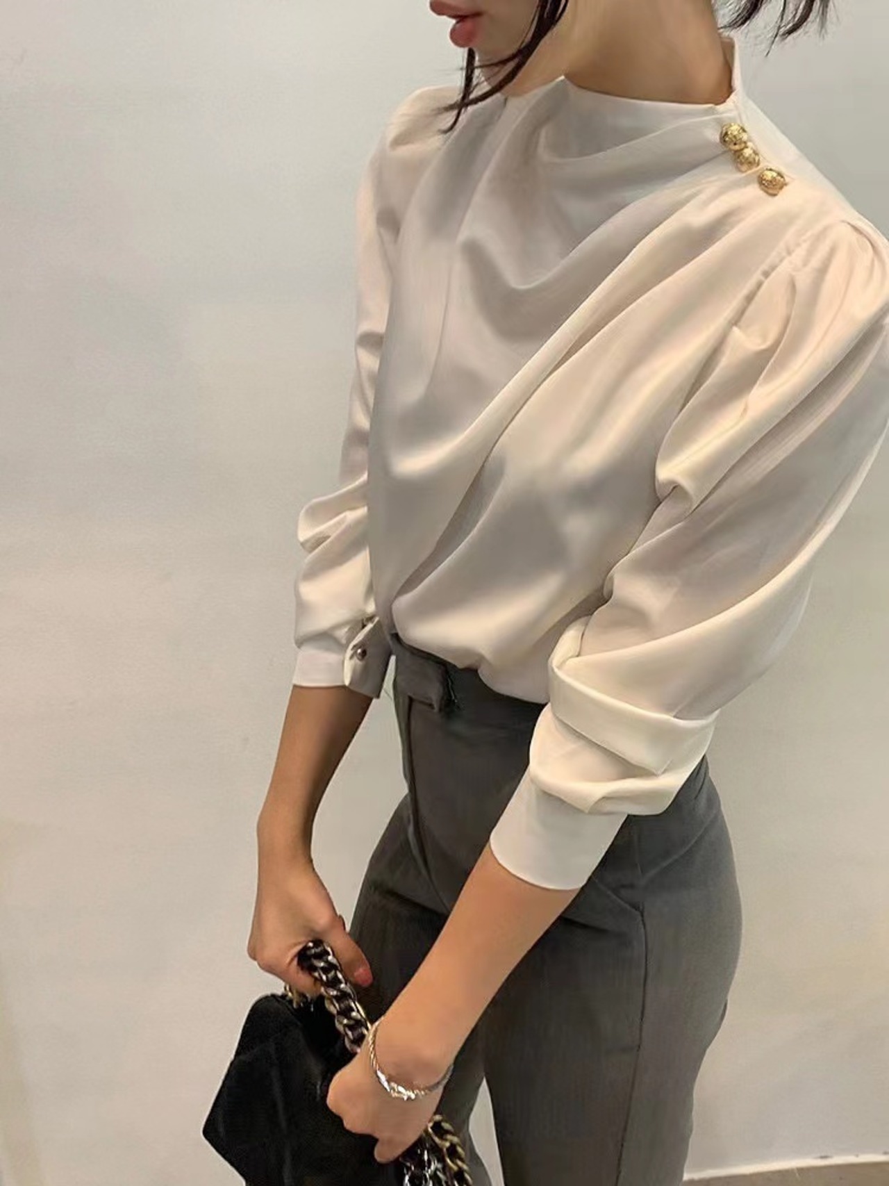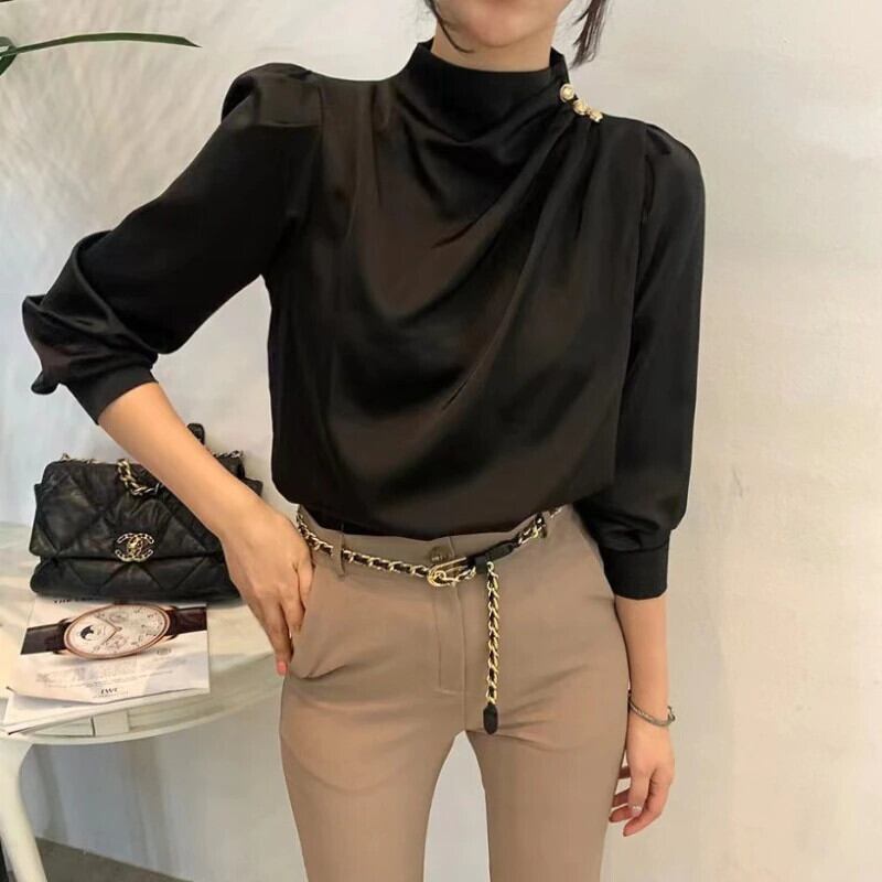 ノミクマ ボタン ハーフカラー パフスリーブ ブラウス レディース 春秋 2023 プルオーバー シャツ カミーサ スプリング 春物 オータム 秋物 kor13748384021