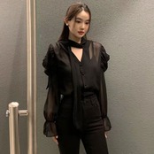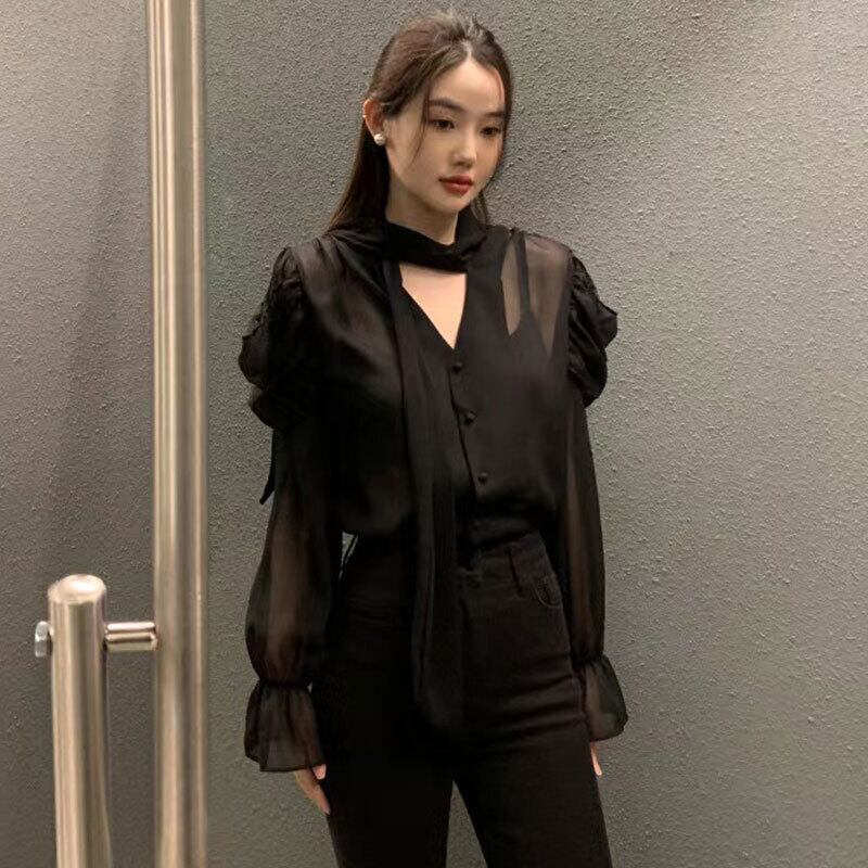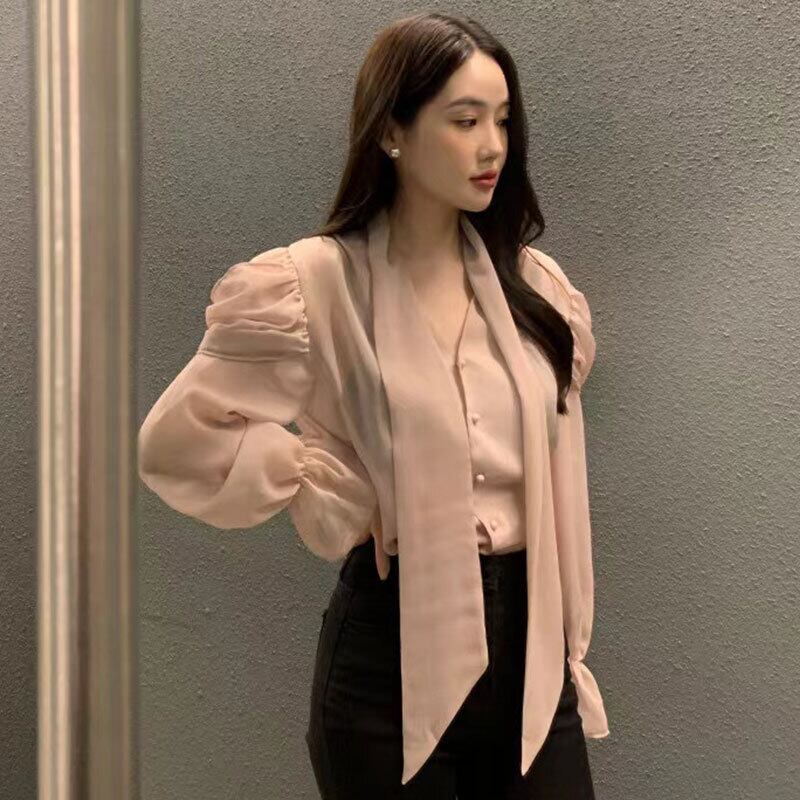 ノミクマ 秋冬 リボン レースアップ Vネック ブラウス シャツ フレアスリーブ カジュアル s es オータム 秋物 ウィンター 冬物 kor57710791147