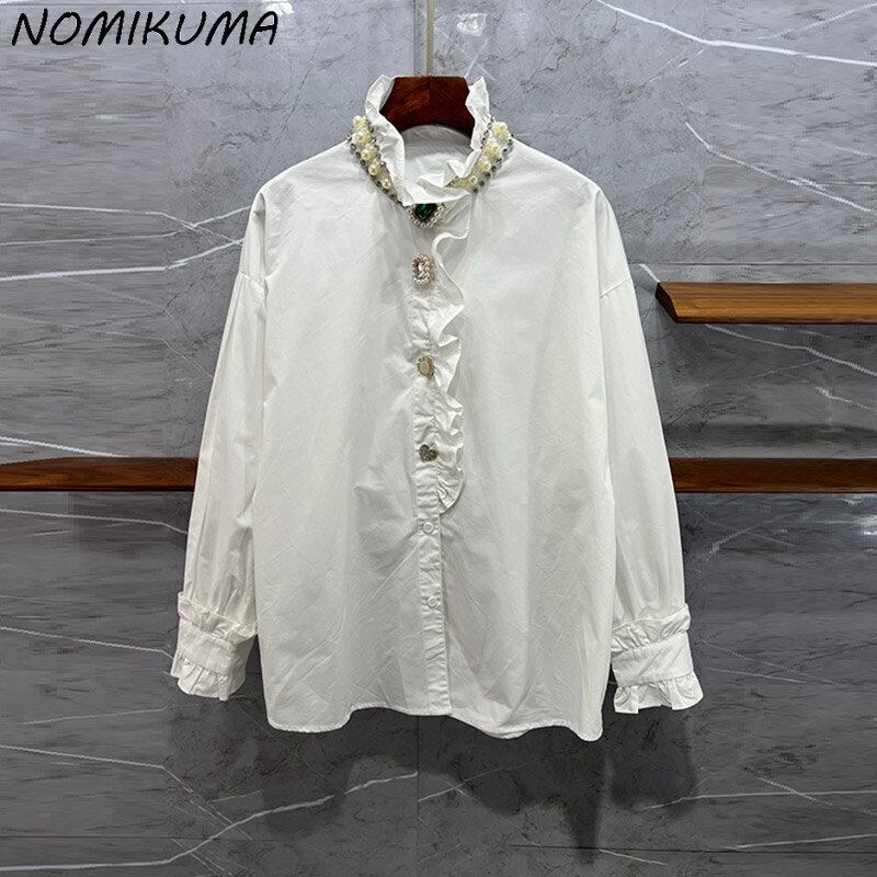 Nomikuma シックなダイヤモンド ビーズ フリル スタンド ネック ブラウス女性 2023 春ランタン スリーブ カミーサ ランタンスリーブ スプリング 春物 kor89838377251