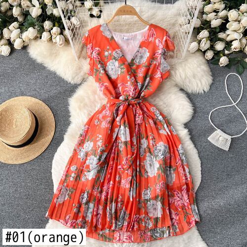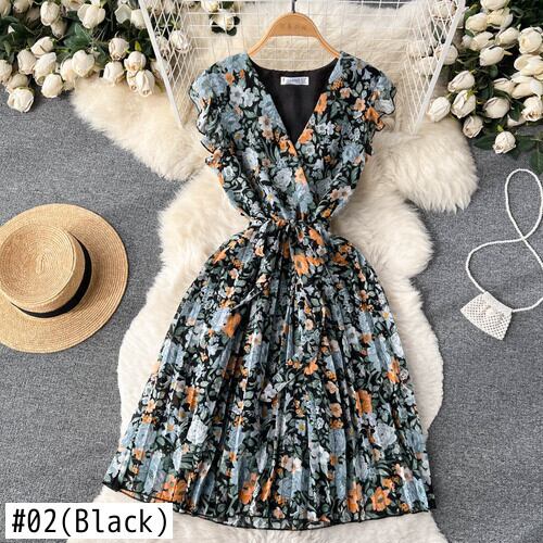 Nomikuma 春夏印刷シフォン女性ドレス弓包帯スリムウエスト A ラインプリーツドレス 2023 Vestidos リボン スプリング 春物 サマー 夏物 Aライン kor43028726019