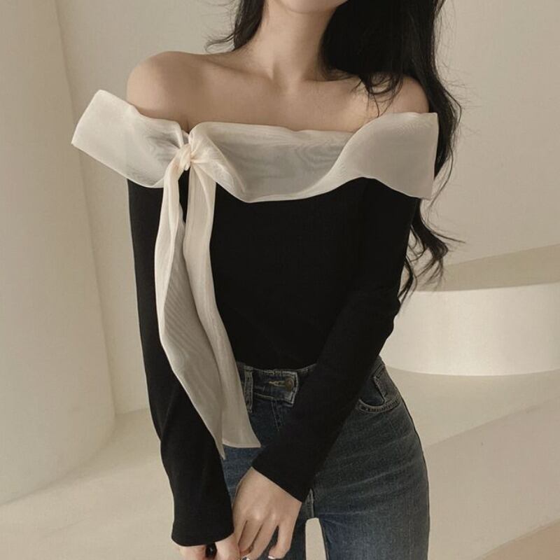 ノミクマ甘いちょう結びオフショルダー長袖トップス 2023 春スリム底入れグラフィック T シャツ ロング リボン 大人ガーリー スウィート キュート カジュアル スプリング 春物 Tシャツ kor92800169260