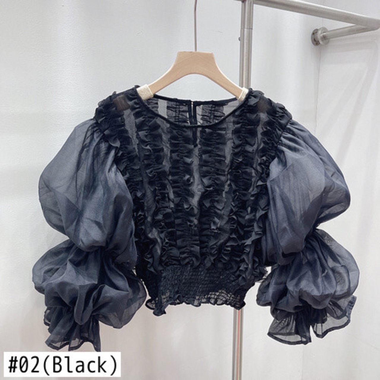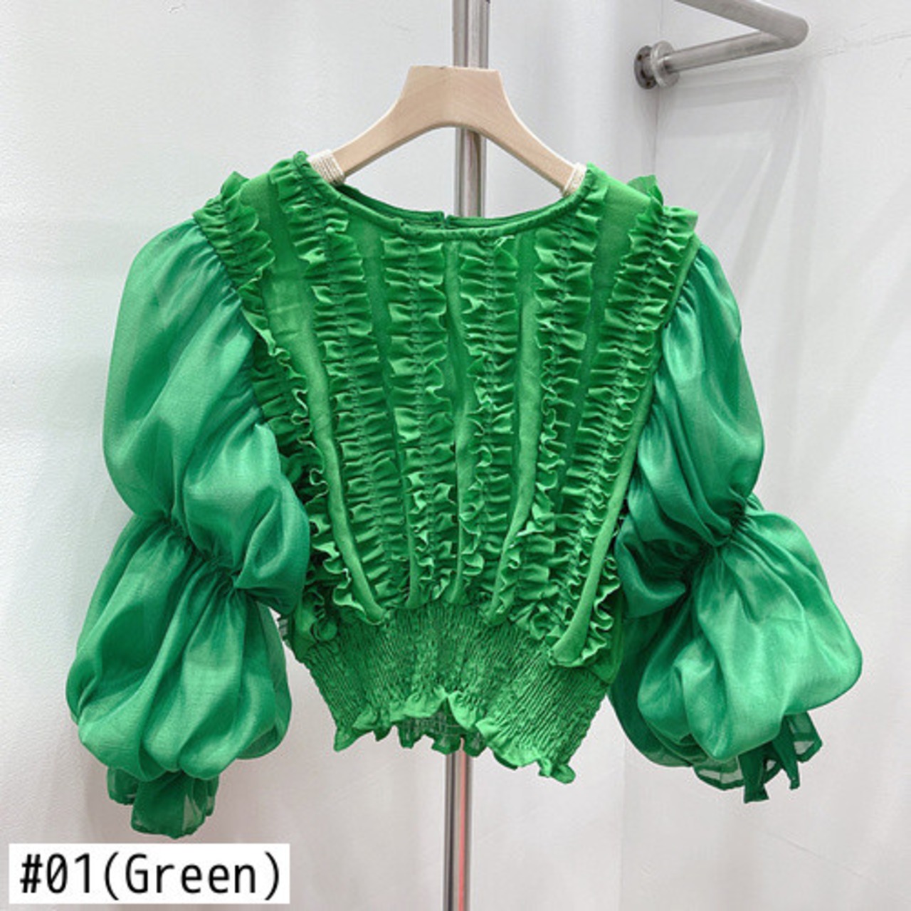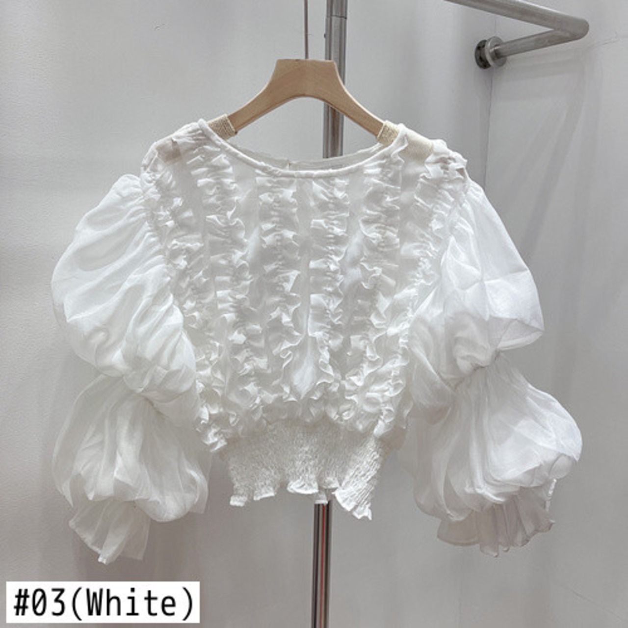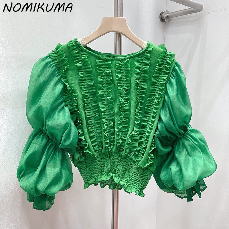 Nomikuma シックなフリル パッチワーク ショート ブラウス トップス ランタン スリーブ O ネック プルオーバー 2023 春夏スウィート ドール シャツ ランタンスリーブ 大人ガーリー キュート カジュアル スプリング 春物 サマー 夏物 Oネック kor76759690817