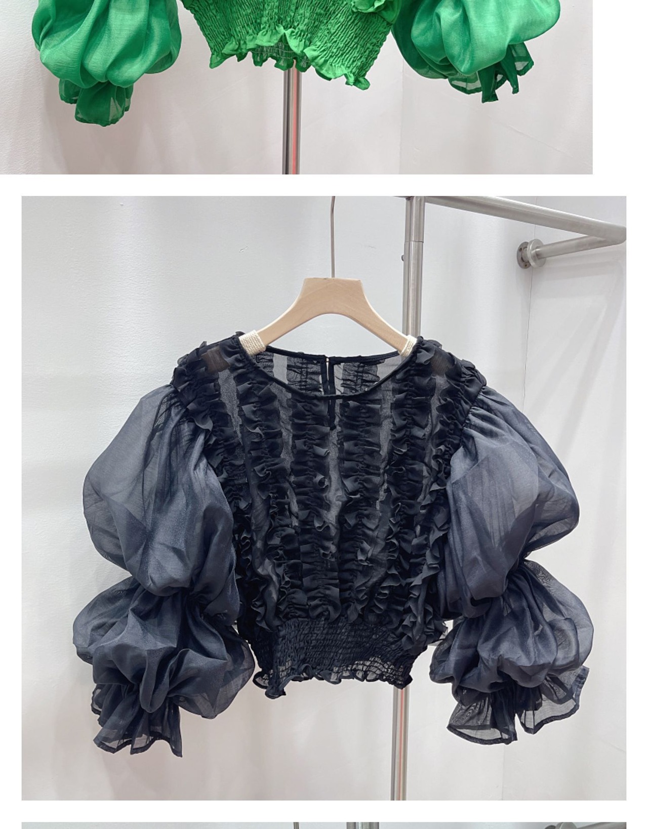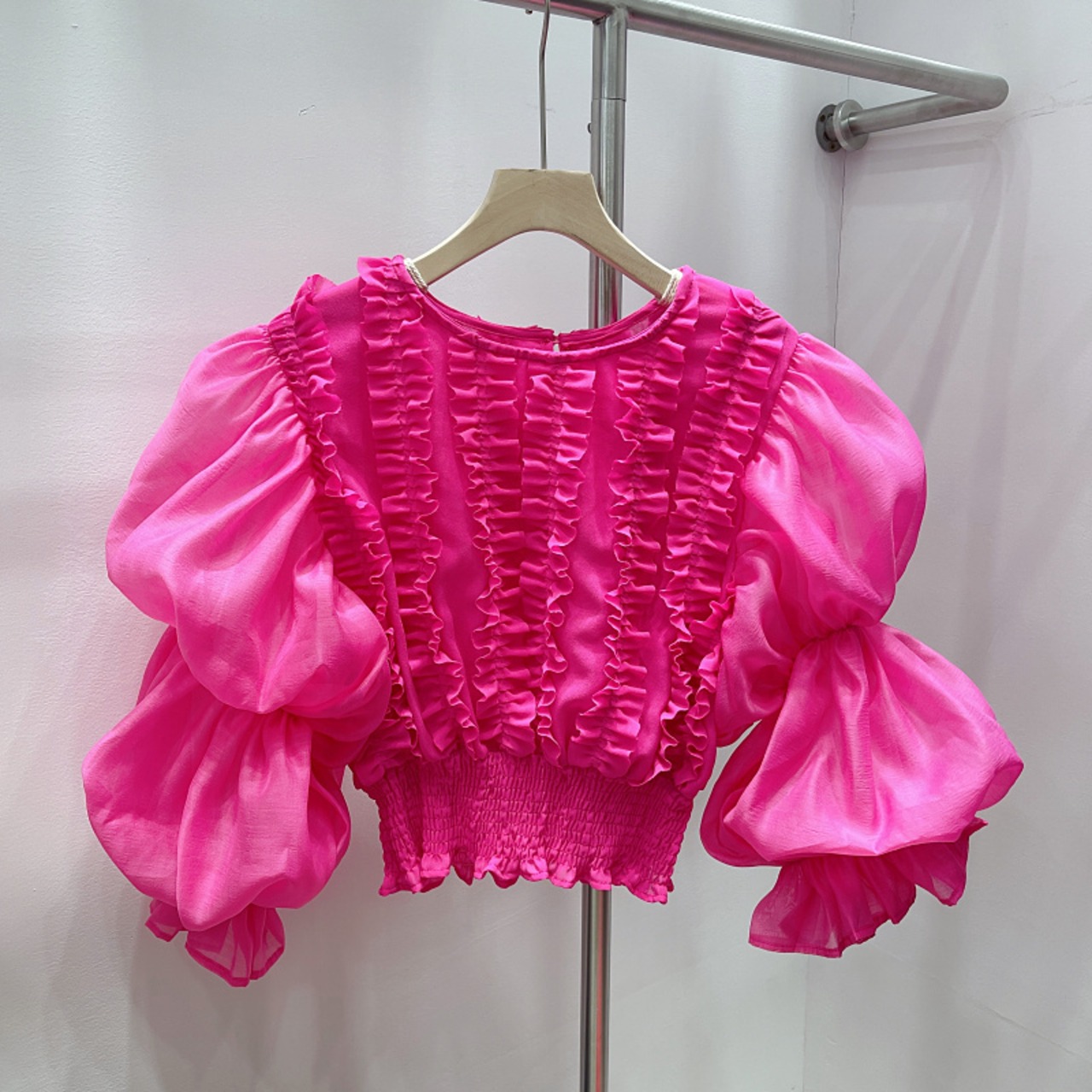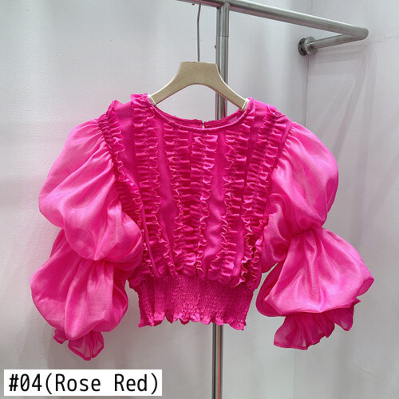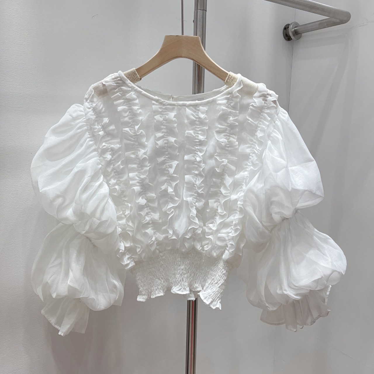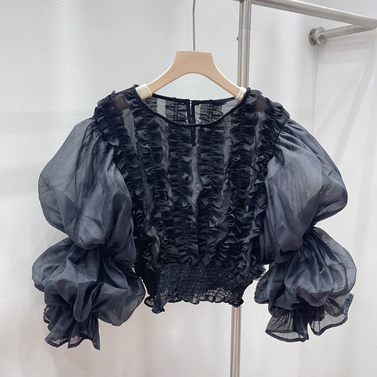 Nomikuma シックなフリル パッチワーク ショート ブラウス トップス ランタン スリーブ O ネック プルオーバー 2023 春夏スウィート ドール シャツ ランタンスリーブ 大人ガーリー キュート カジュアル スプリング 春物 サマー 夏物 Oネック kor76759690817