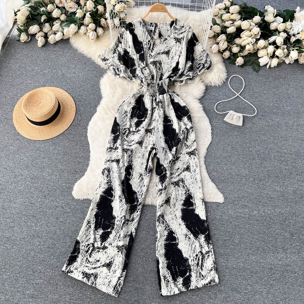 Nomikuma 夏プリント女性ジャンプスーツ因果半袖 V ネックウエストボディスーツワイド脚ロンパース ショート ハーフスリーブ サマー 夏物 Vネック ワイドレッグ ワイドパンツ kor53598909966