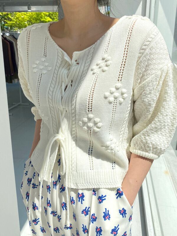 Nomikuma シックなツイスト 3D 花因果ショートカーディガンシックな春パフスリーブ O ネックコート女性生き抜くトップス スプリング 春物 Oネック フラワーデザイン kor90297387104