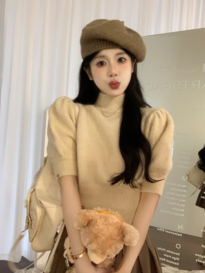 Nomikuma スウィート パフスリーブ ハーフカラー ニットウェア トップス 春 レディース スリム ショート プルオーバー セーター 大人ガーリー キュート カジュアル スプリング 春物 kor72152416933