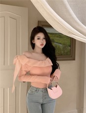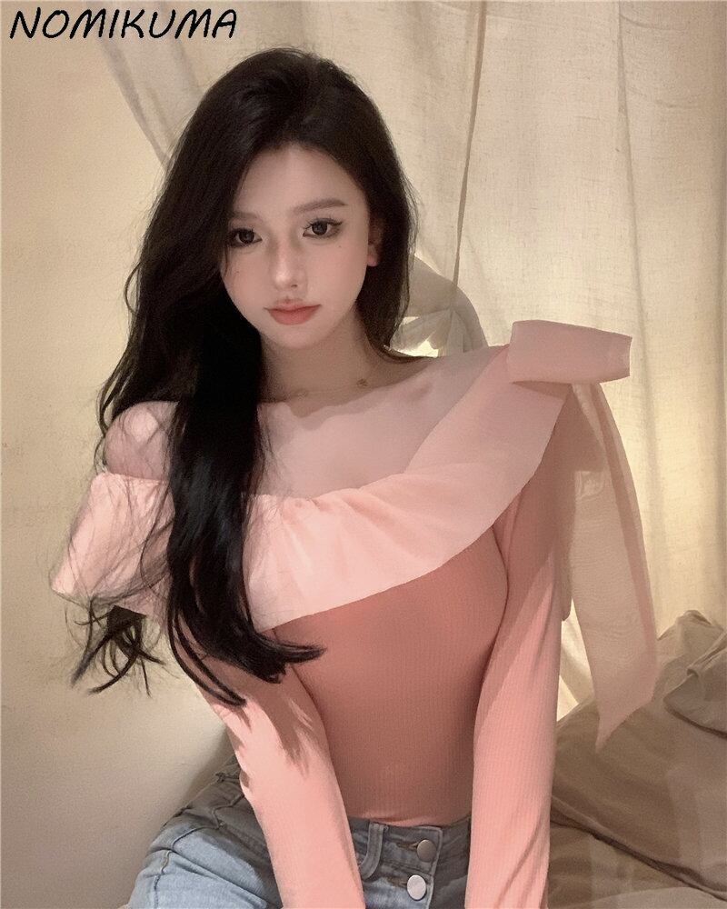 Nomikuma セクシーなフリルオフショルダー弓包帯ストラップレス Tシャツ女性長袖春底入れグラフィック Tシャツ ロング リボン スプリング 春物 kor32611284367