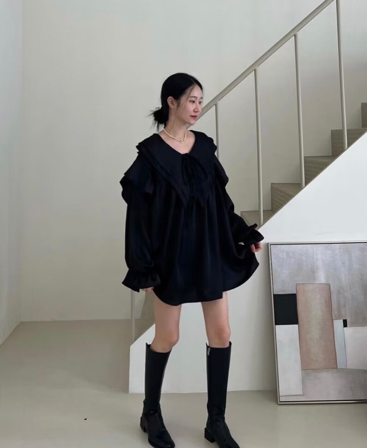 Nomikuma 因果フレア長袖ドレス女性シックな春レースアップターンダウン襟ドレス甘い Vestidos ロング 大人ガーリー スウィート キュート カジュアル スプリング 春物 kor24502750538
