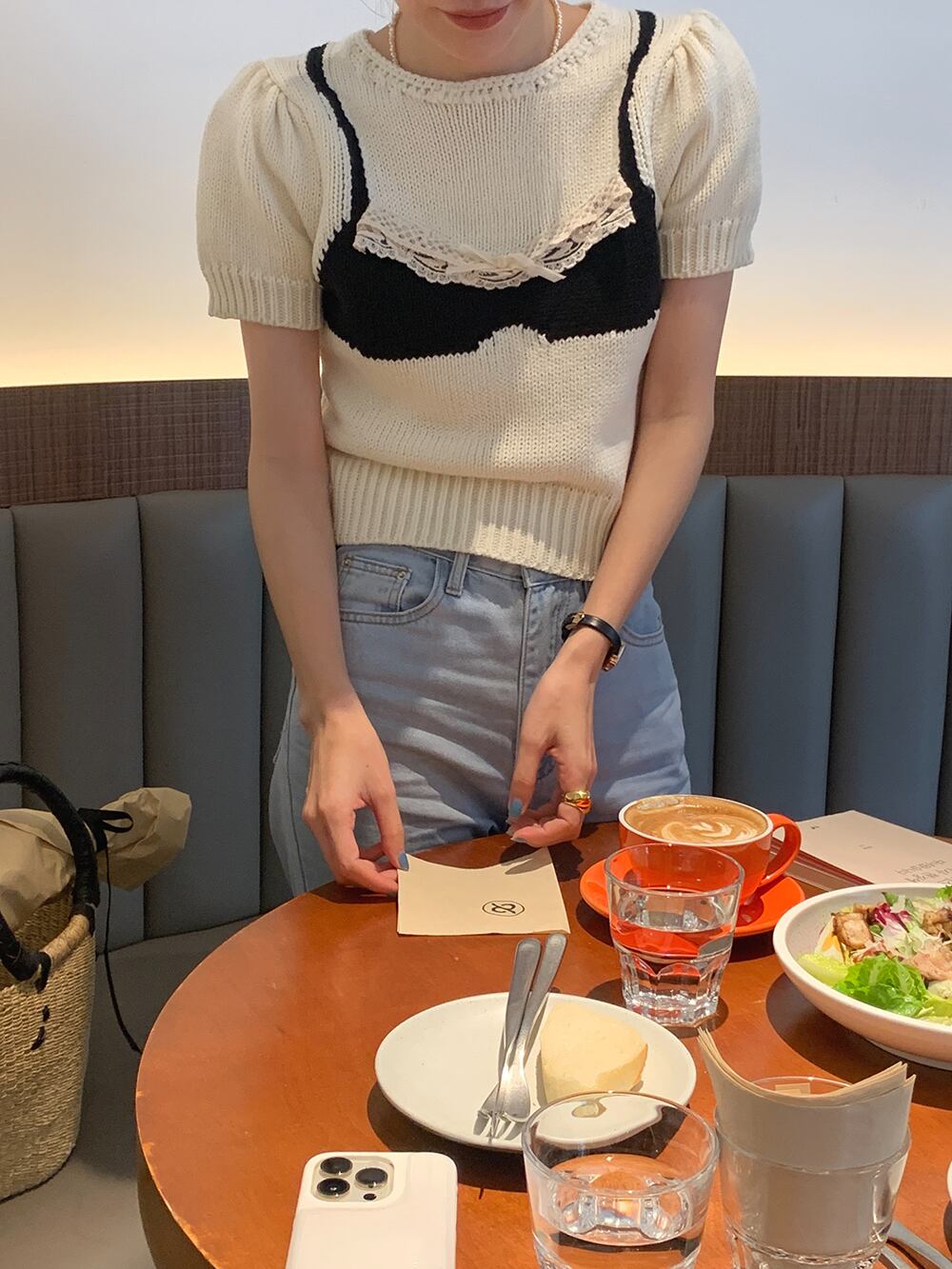 ノミクマ レース パッチワーク ウエストセーター 因果 パフスリーブ Oネック プルオーバー ニット 春夏 ニットトップス スプリング 春物 サマー 夏物 kor99138727099