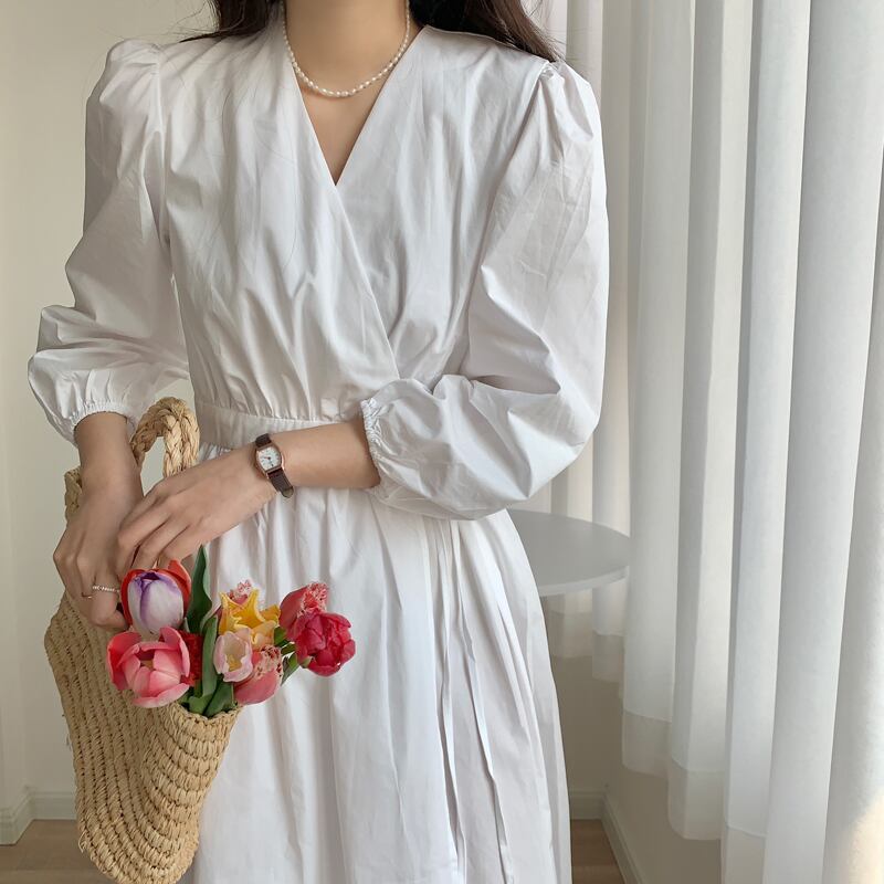 Nomikuma V ネックレースアップスリムウエストパフスリーブロングドレス女性春 A ラインドレス Vestidos スプリング 春物 Vネック Aライン kor25543440242