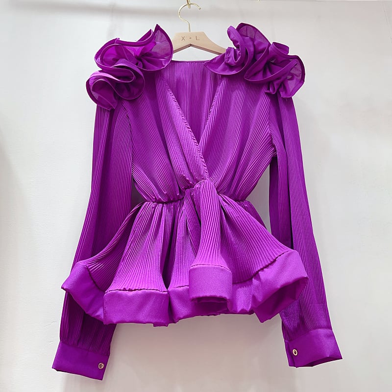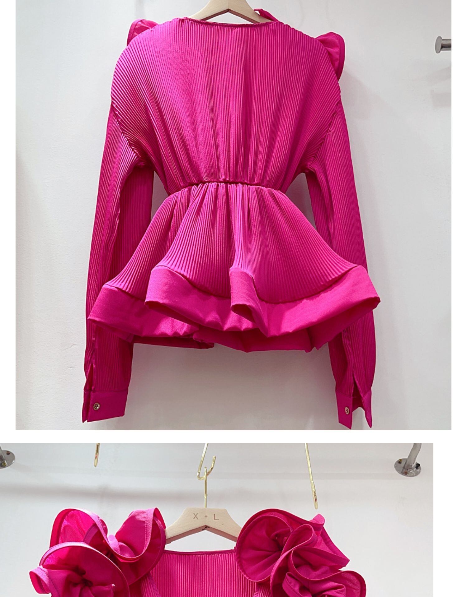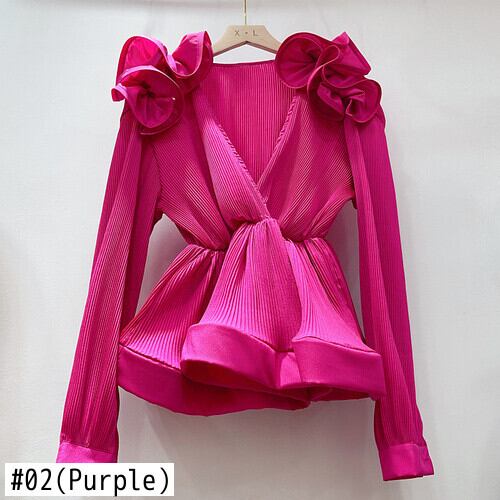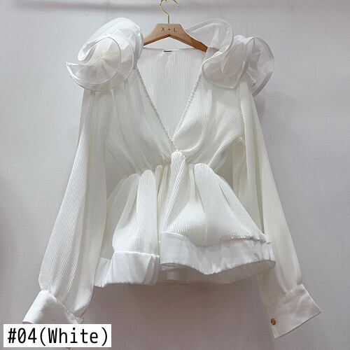 ノミクマ 春 立体 花 ブラウス トップス 長袖 Vネック スリムウエスト フリル シャツ カミーサ ロング スプリング 春物 フラワーデザイン kor39733203152