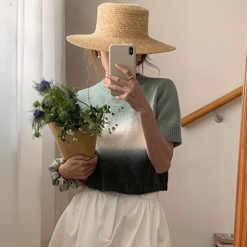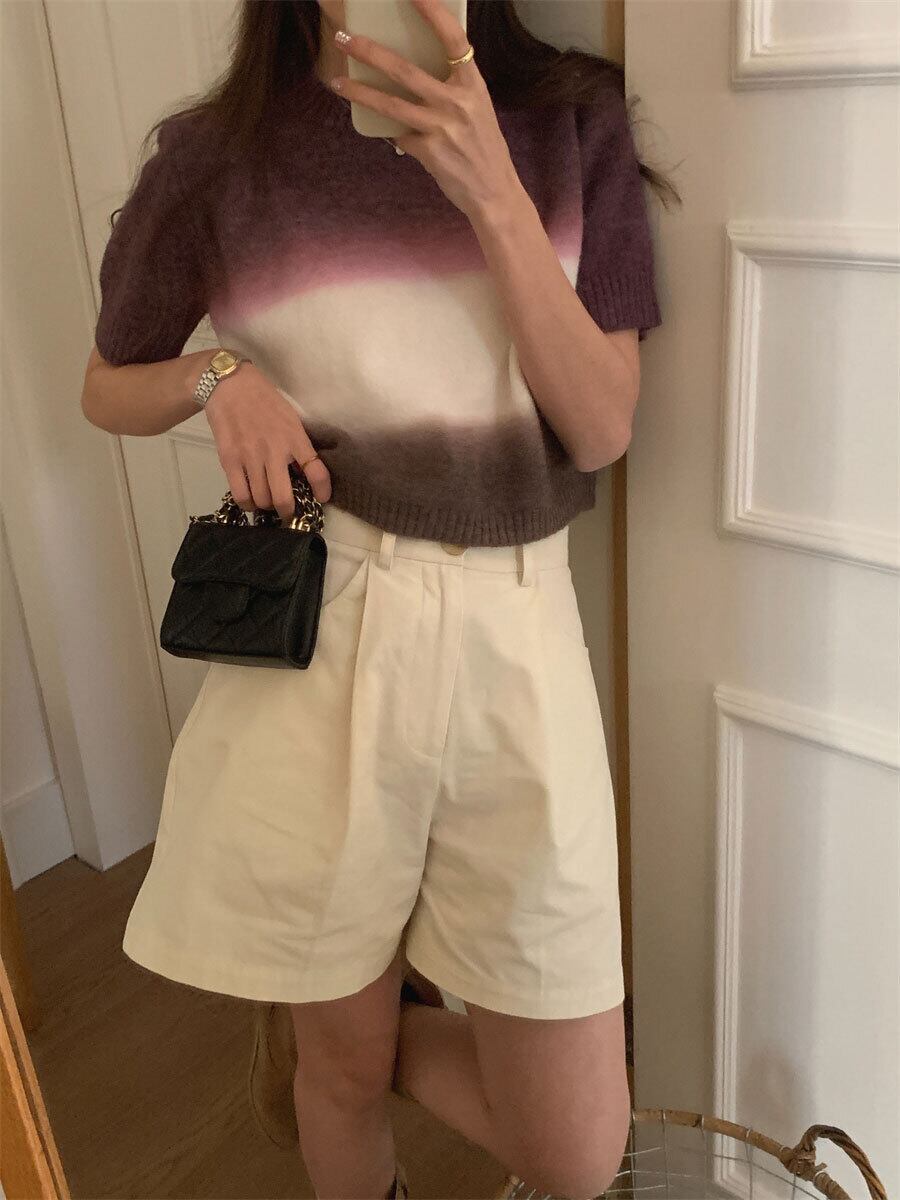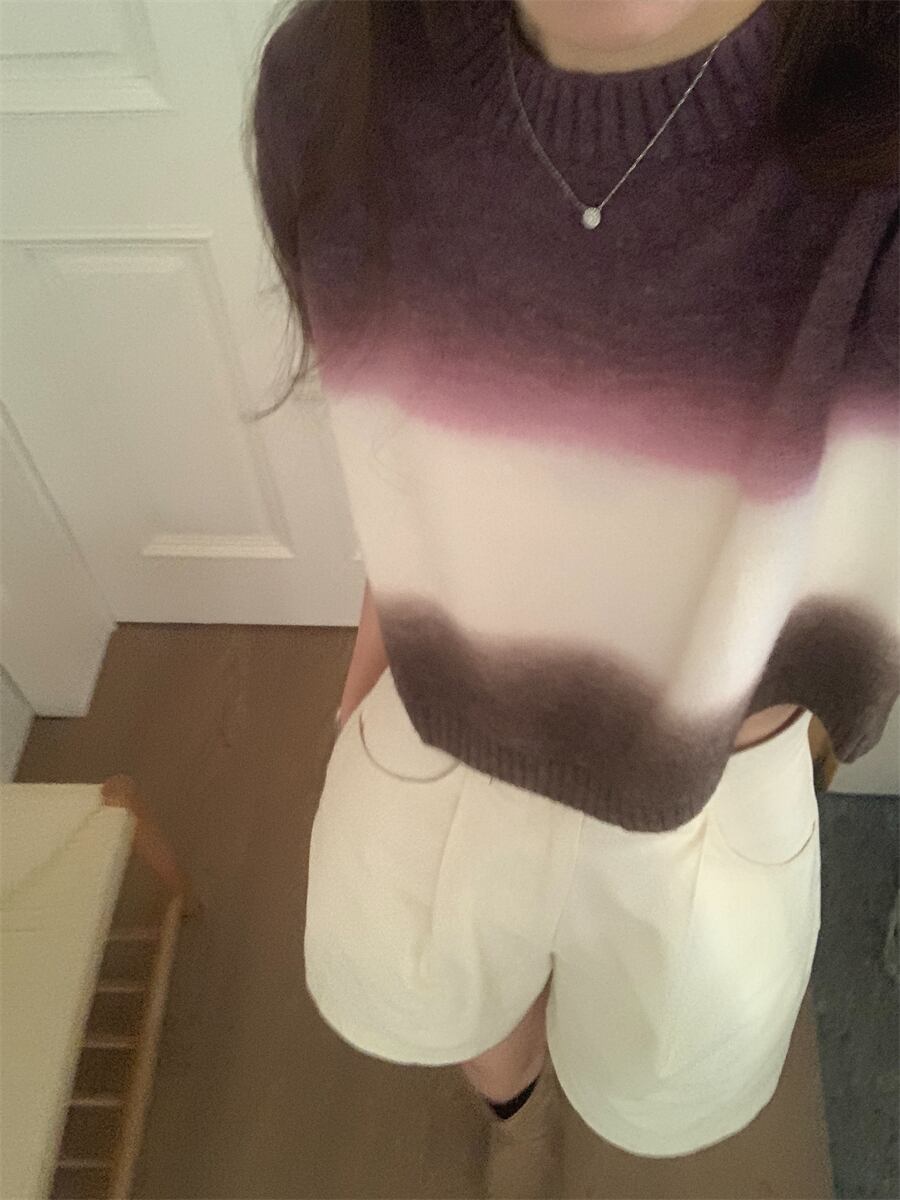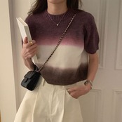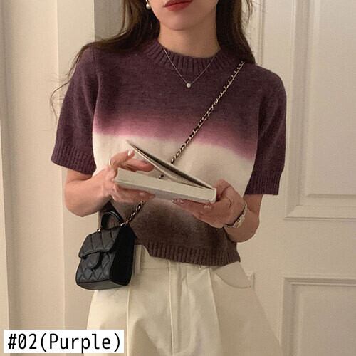 ノミクマ シック 春 Oネック グラデーション ヒットカラー ニット トップス カジュアル 半袖 プルオーバー セーター ショート ハーフスリーブ スプリング 春物 kor10941338641