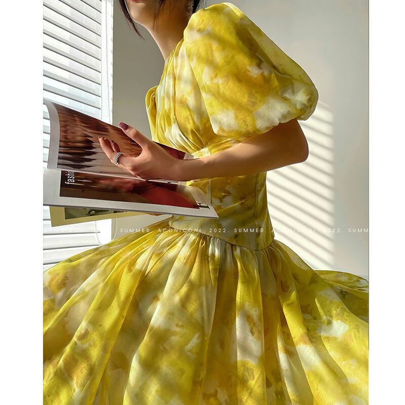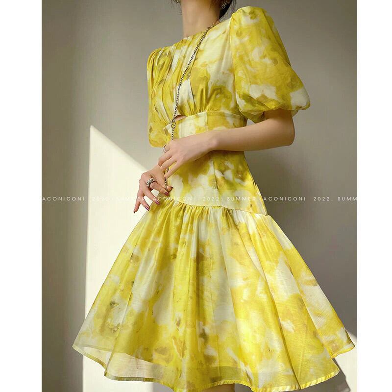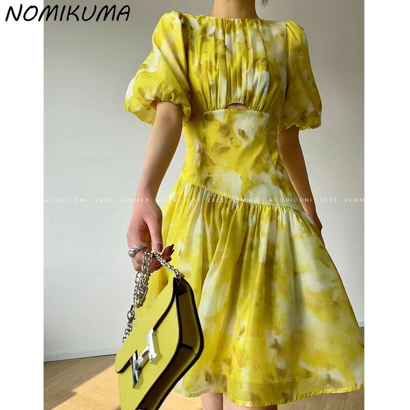 Nomikuma シフォン印刷ランタンスリーブ O ネックの女性のドレス夏ウエストドレス因果 A ライン Vestidos サマー 夏物 Oネック Aライン kor61064241980