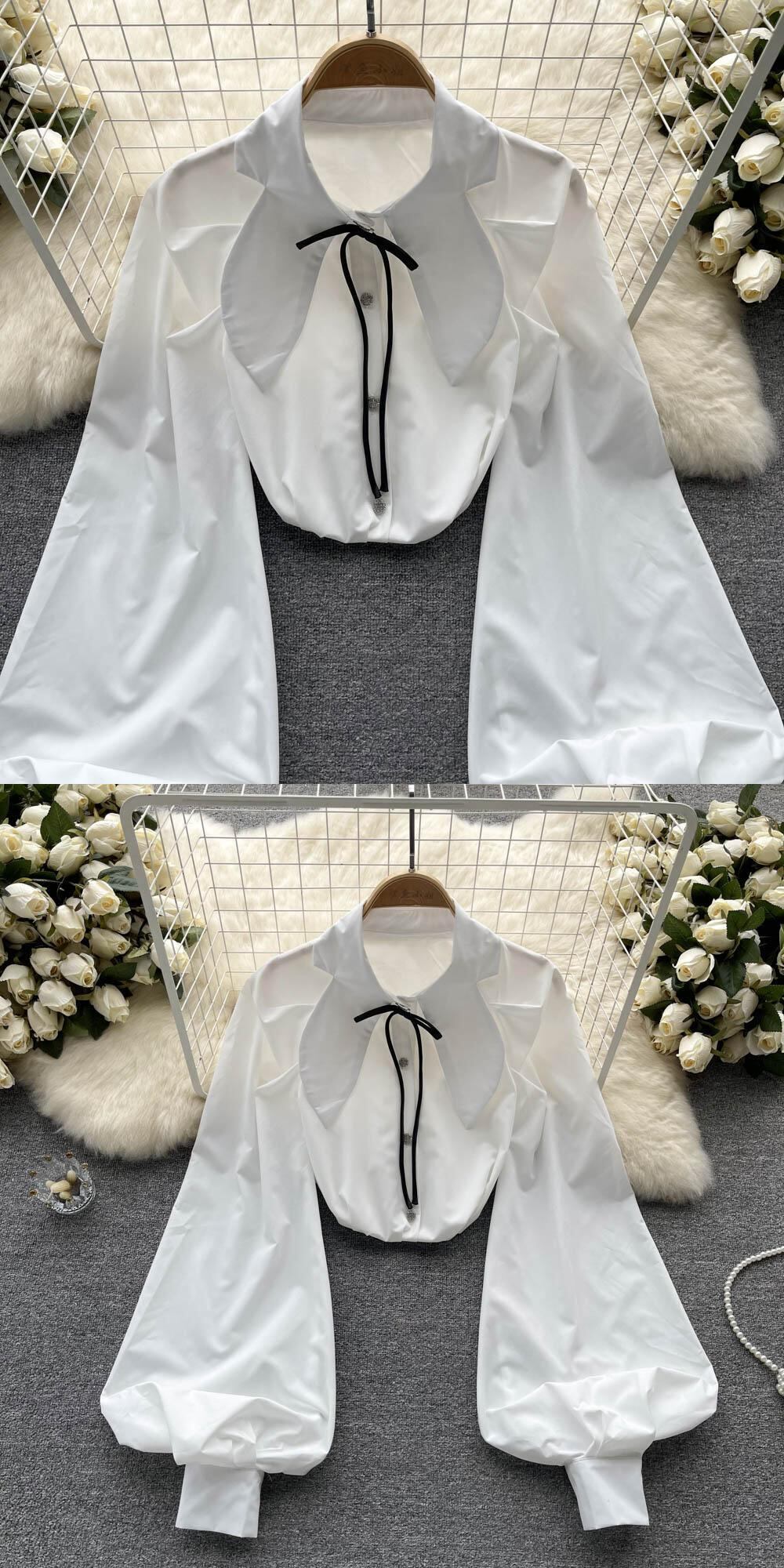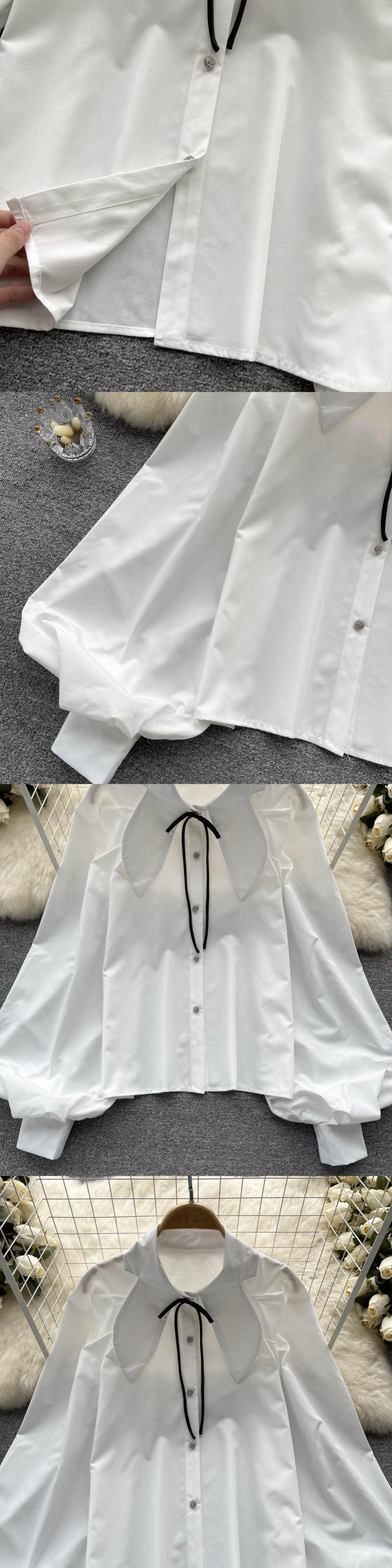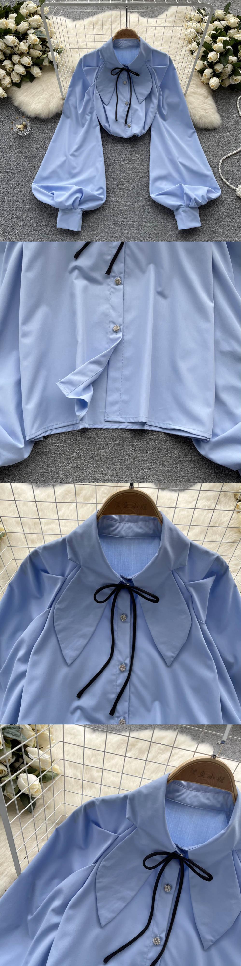 Nomikuma シックな蝶ネクタイピーターパン襟ブラウストップス因果ランタンスリーブ女性シャツ春 Femininos リボン スプリング 春物 kor50416703878