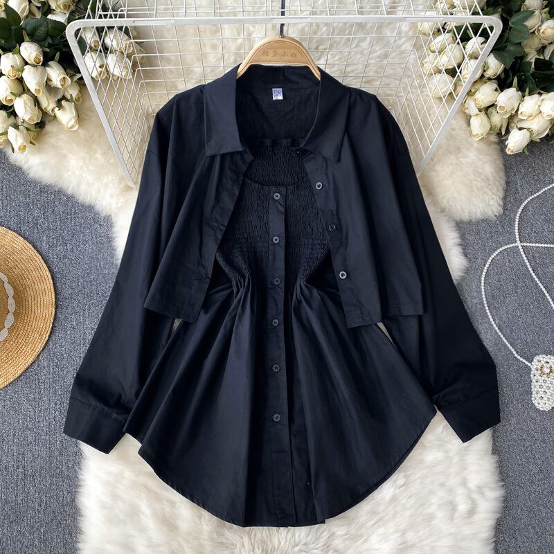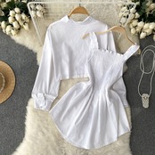 Nomikuma 春秋ツーピース女性セット長袖ターンダウン襟ショートブラウス + フリルスリムウエストスパゲッティストラップドレス ロング スプリング 春物 オータム 秋物 kor77930706864