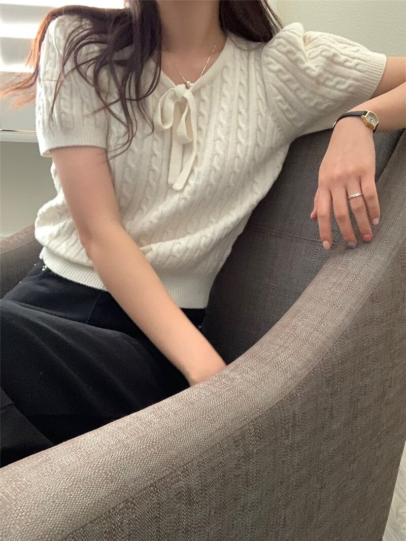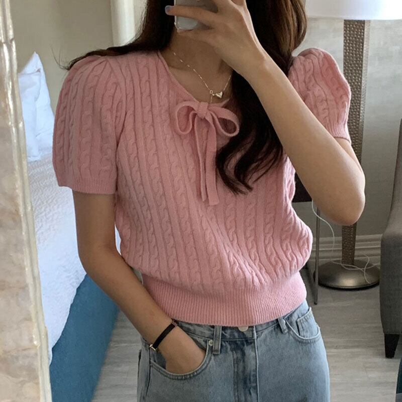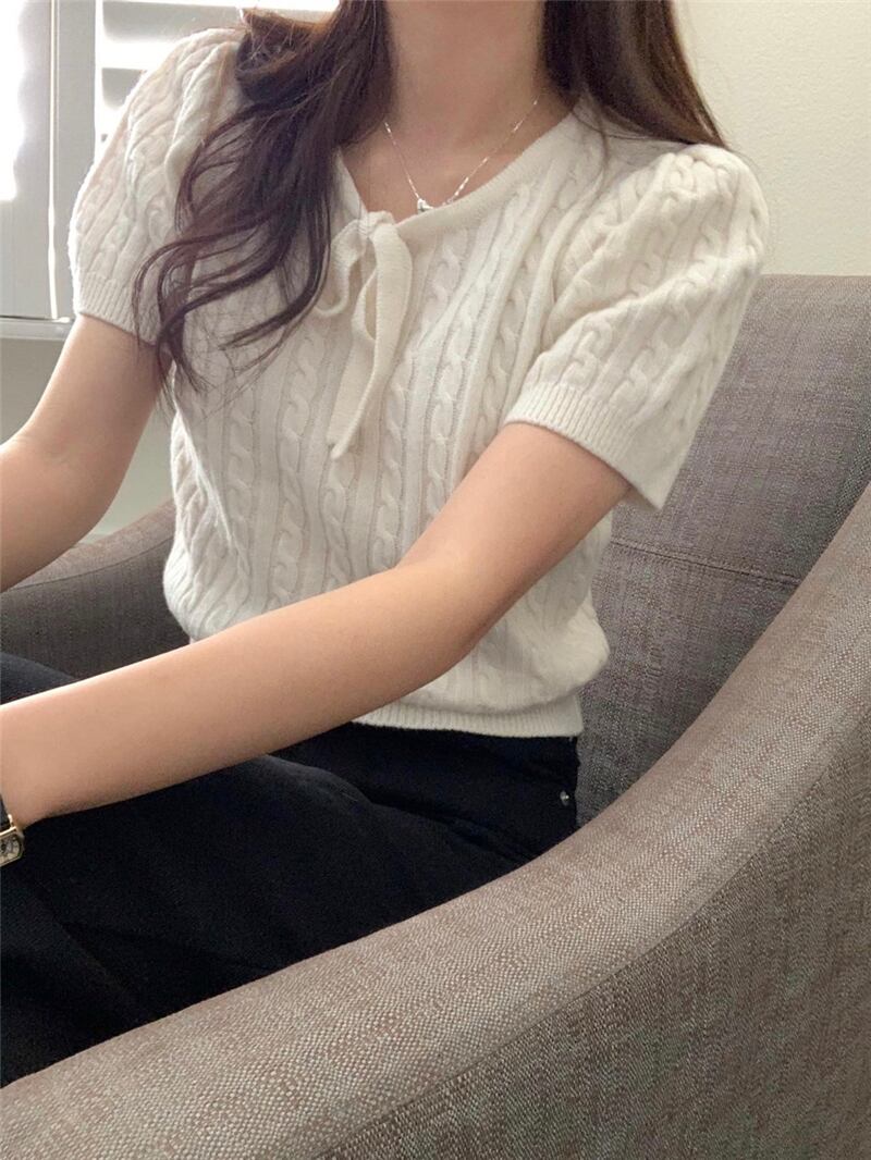 Nomikuma 春夏 スイート 蝶ネクタイ Oネック プルオーバー ツイスト セーター カジュアル シック スイート パフスリーブ ニット トップス リボン 大人ガーリー スウィート キュート スプリング 春物 サマー 夏物 kor57791890722
