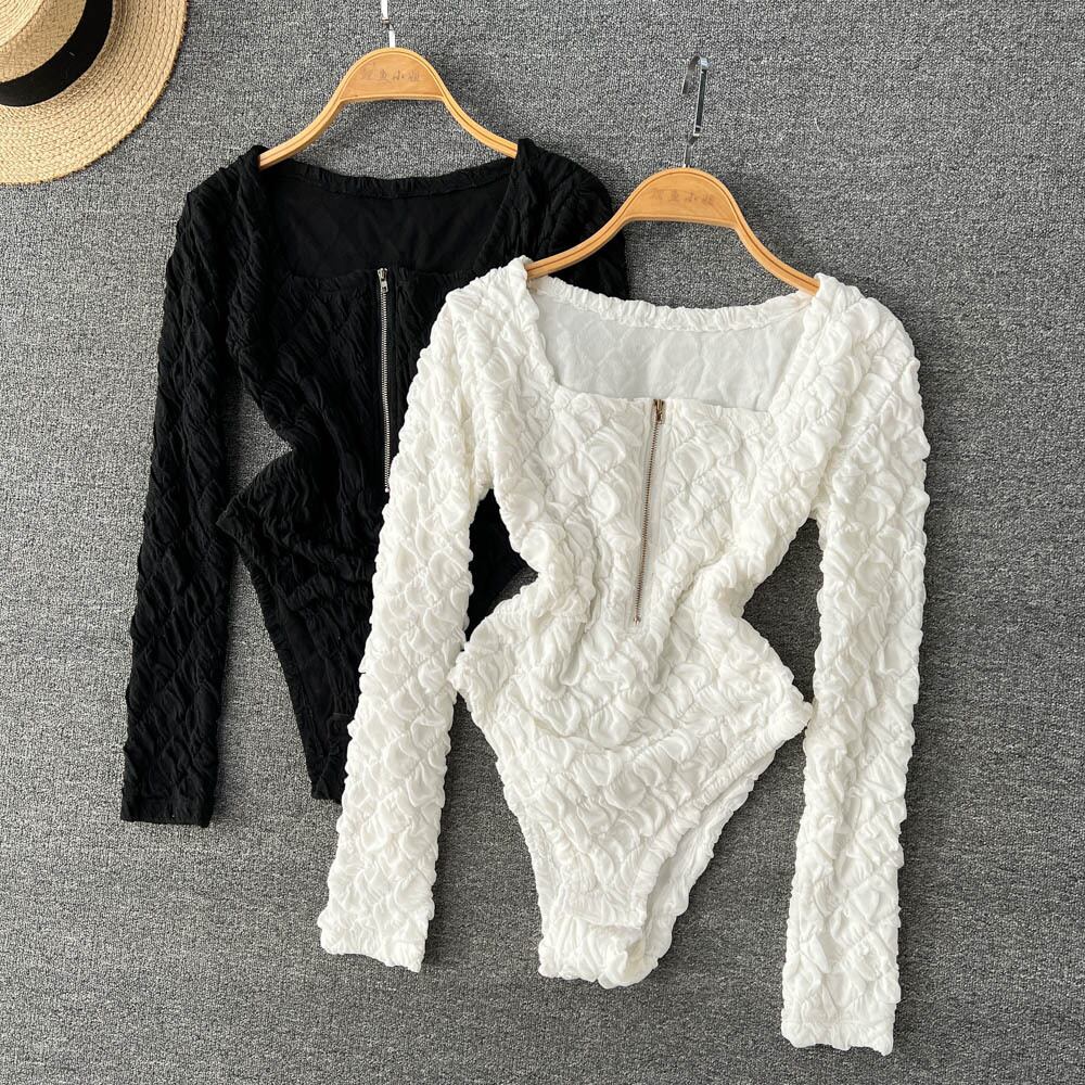 Nomikuma 春夏ロンパーススクエアカラー長袖スリム女性ロンパースセクシーなスリムウエストボディスーツ ロング スプリング 春物 サマー 夏物 スクウェア kor35286215719