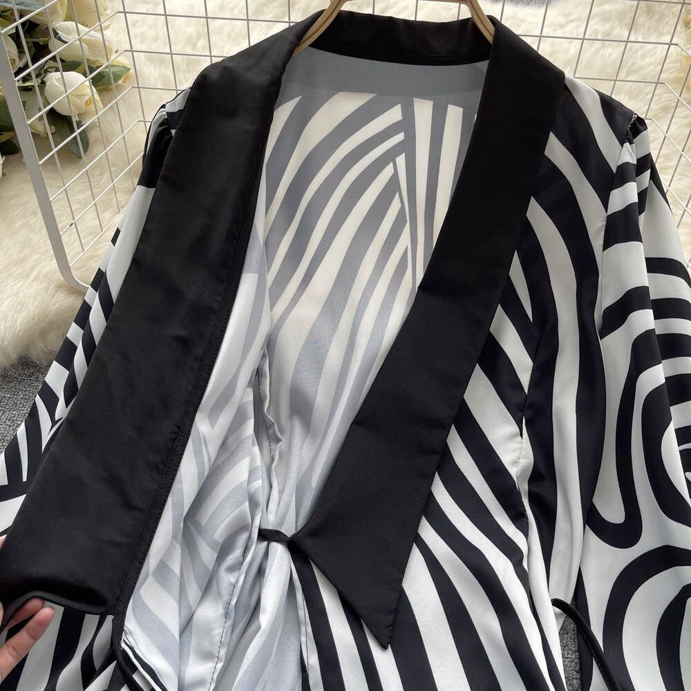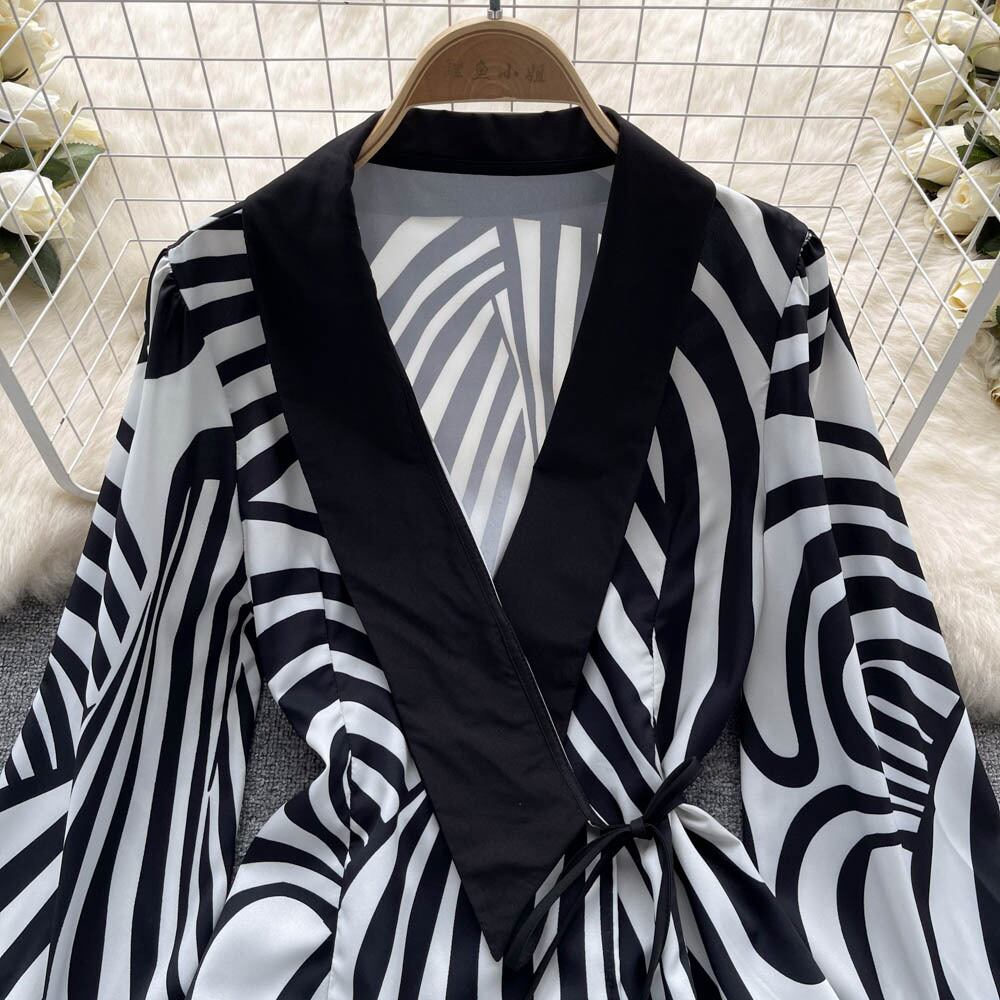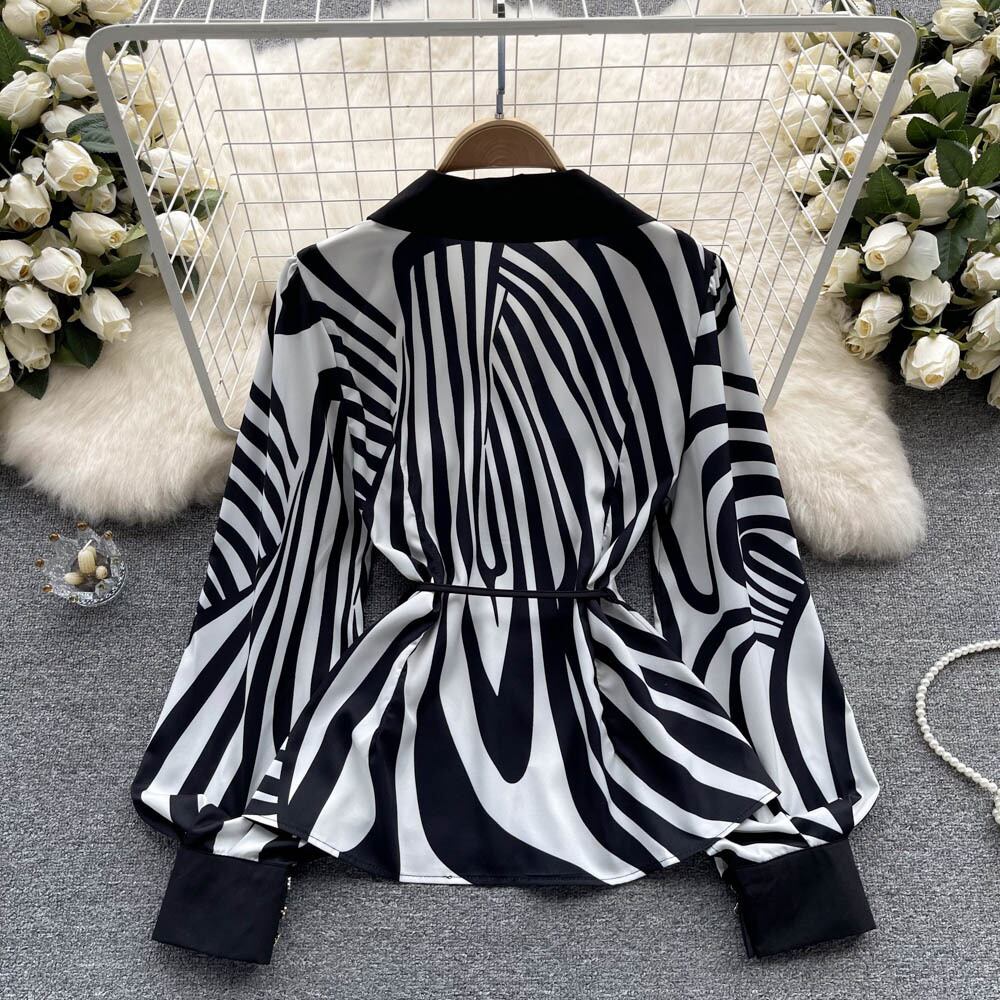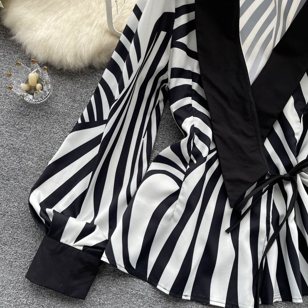 Nomikuma 春秋ストライプブラウスシャツレースアップスリムウエストランタンスリーブ V ネックレディーストップスデモーダ スプリング 春物 オータム 秋物 Vネック kor65022805249
