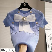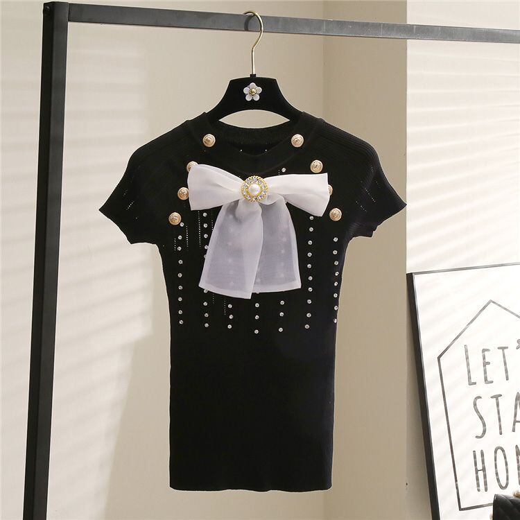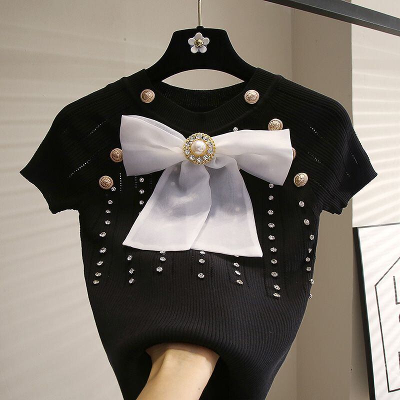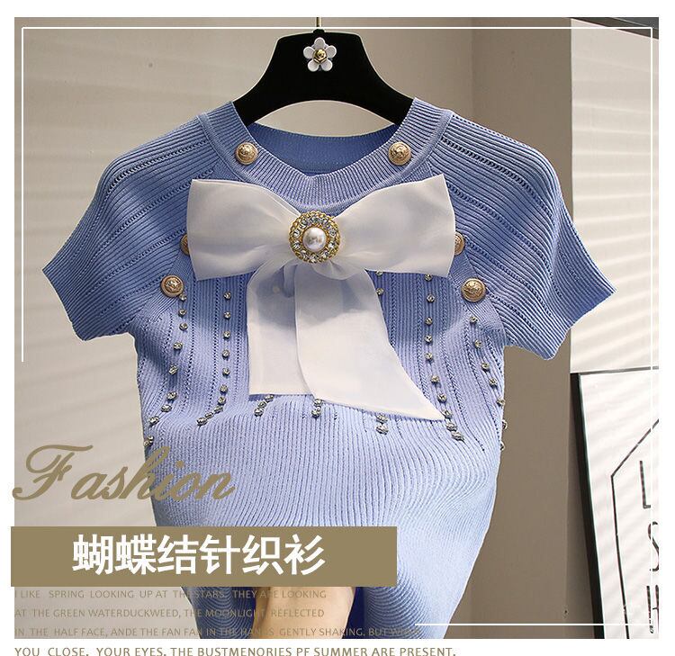 Nomikuma アイスニット女性夏半袖 O ネックダイヤモンド甘いちょう結びニットトップス ショート リボン ハーフスリーブ 大人ガーリー スウィート キュート カジュアル サマー 夏物 Oネック シルク kor53679940415