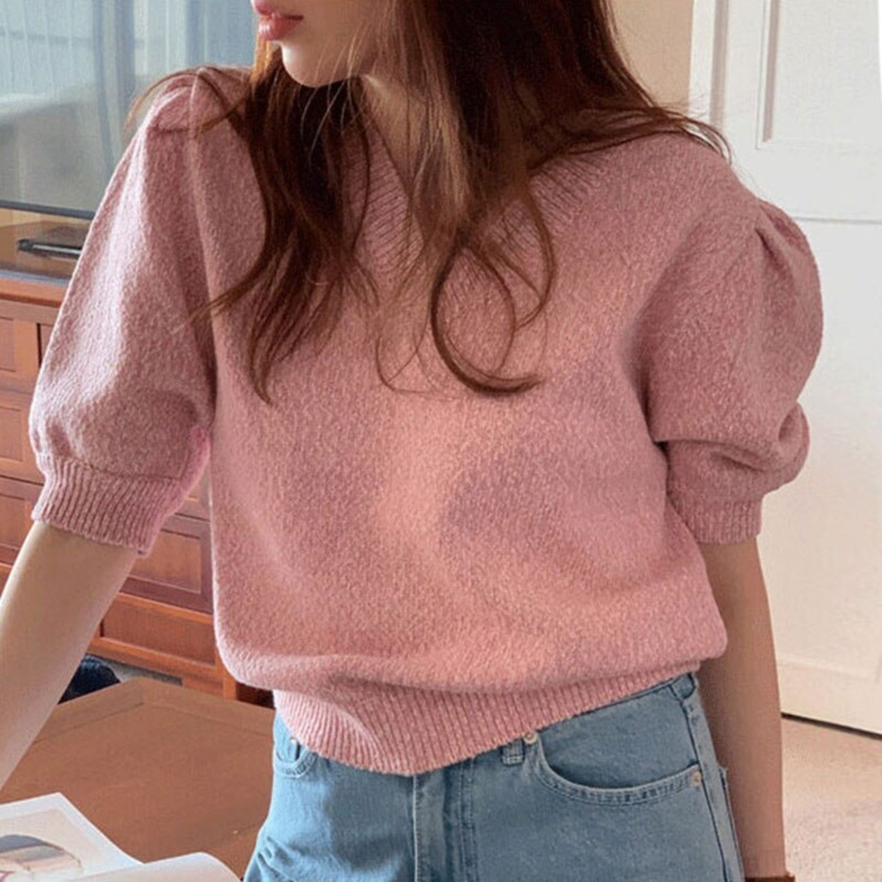 Nomikuma 春 V ネックパフスリーブニットセーター因果無地甘い女性ニット無地プルオーバープル 大人ガーリー スウィート キュート カジュアル スプリング 春物 Vネック ソリッドカラー kor52340459090