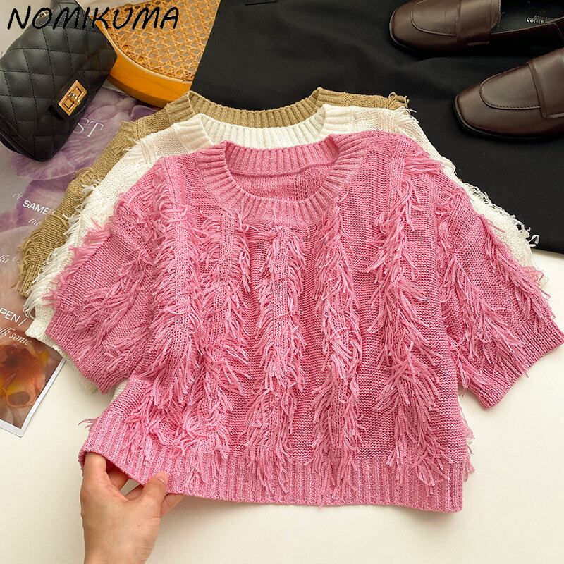 Nomikuma シックな Tel O ネック半袖ニットウェア女性春夏セータースリムニットプルオーバートップス ショート ハーフスリーブ スプリング 春物 サマー 夏物 Oネック kor79582127667