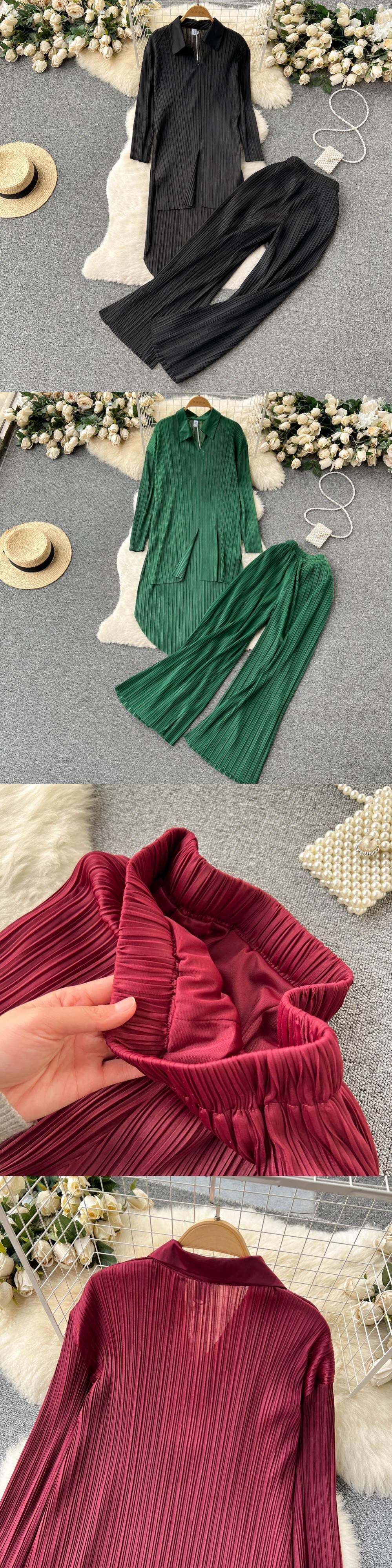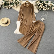 Nomikuma 春ツーピース女性衣装因果不規則なターンダウン襟ロングブラウストップ + ウエストワイドレッグロングパンツ スプリング 春物 ワイドパンツ kor86517997718