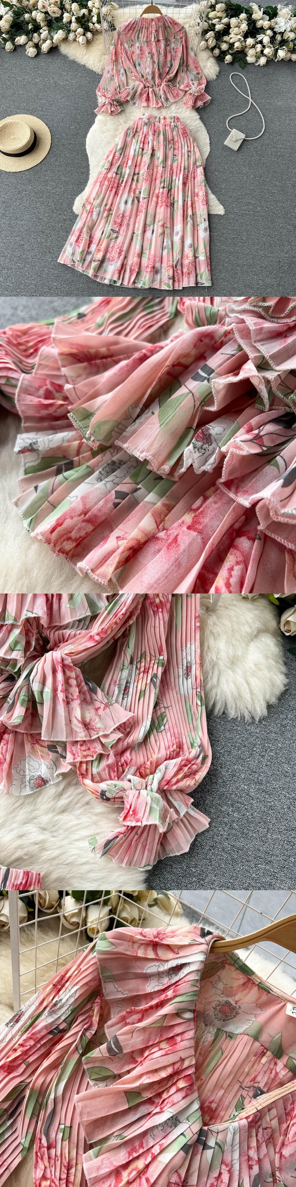 Nomikuma 春秋花柄セット女性フリル V ネックトップス + ウエスト因果 A ラインプリーツスカート 2 ピース スプリング 春物 オータム 秋物 Vネック Aライン kor30993157304