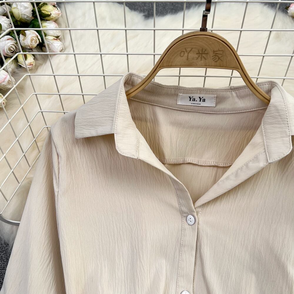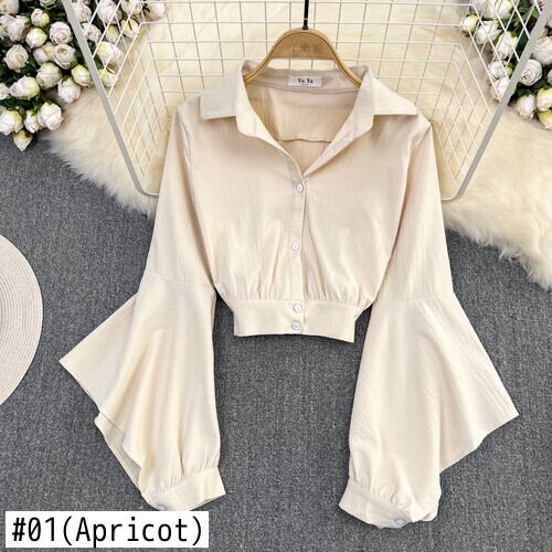 ノミクマ春秋フレアスリーブスリムウエストショートブラウスシャツターンダウンカラー無地トップス スプリング 春物 オータム 秋物 ソリッドカラー kor37582248361