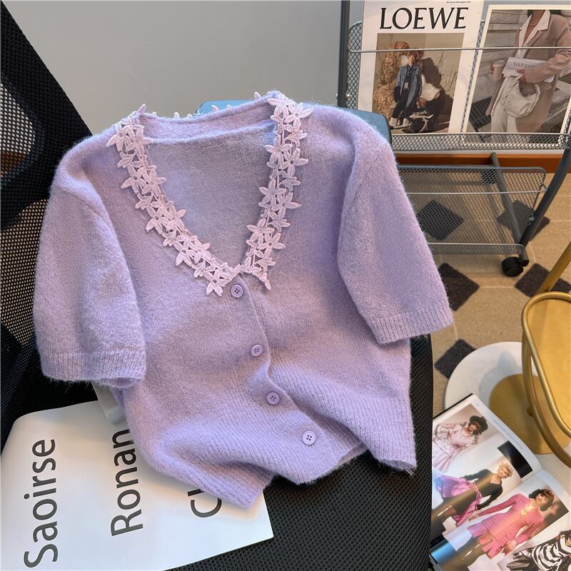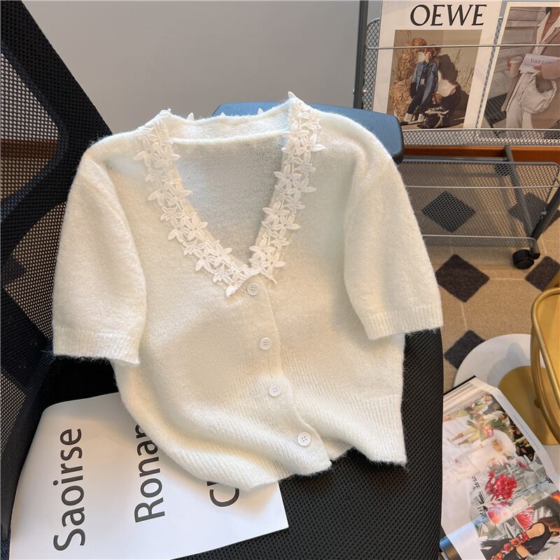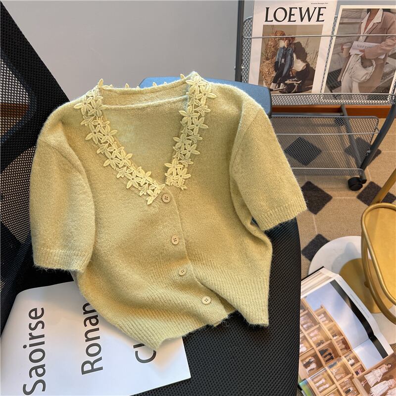ノミクマシックレースパッチワークVネック女性セーターコートシングルブレスト半袖ニットウェア因果ニットカーディガン ショート ハーフスリーブ kor10916445767