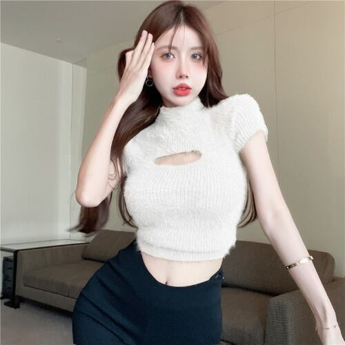Nomikuma レースアップ バックレス 半袖 モヘアニット クロップトップス セクシー 中空アウト ハーフカラー スリム レディース ニットウェア ショート ハーフスリーブ kor44672572994