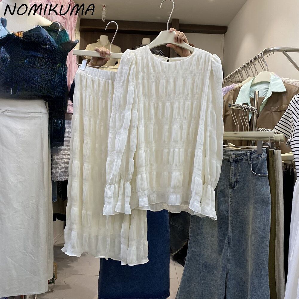 Nomikuma 春夏ツーピース女性セットシックなひだパフスリーブ O ネックブラウストップス + ウエスト因果スカート衣装 スプリング 春物 サマー 夏物 Oネック kor30384912766