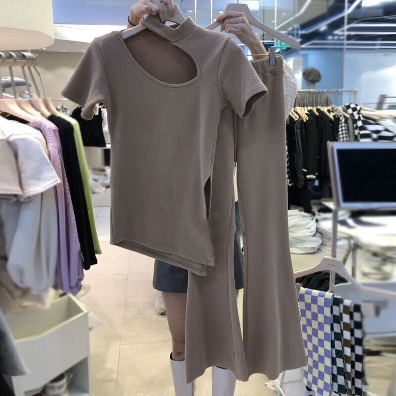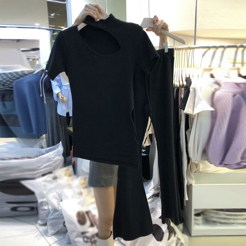 ノミクマ 春夏中空アウト半袖スプリットTシャツ+ウエストスリムフレアロングパンツ2点セット ショート ハーフスリーブ スプリング 春物 サマー 夏物 kor35694041132