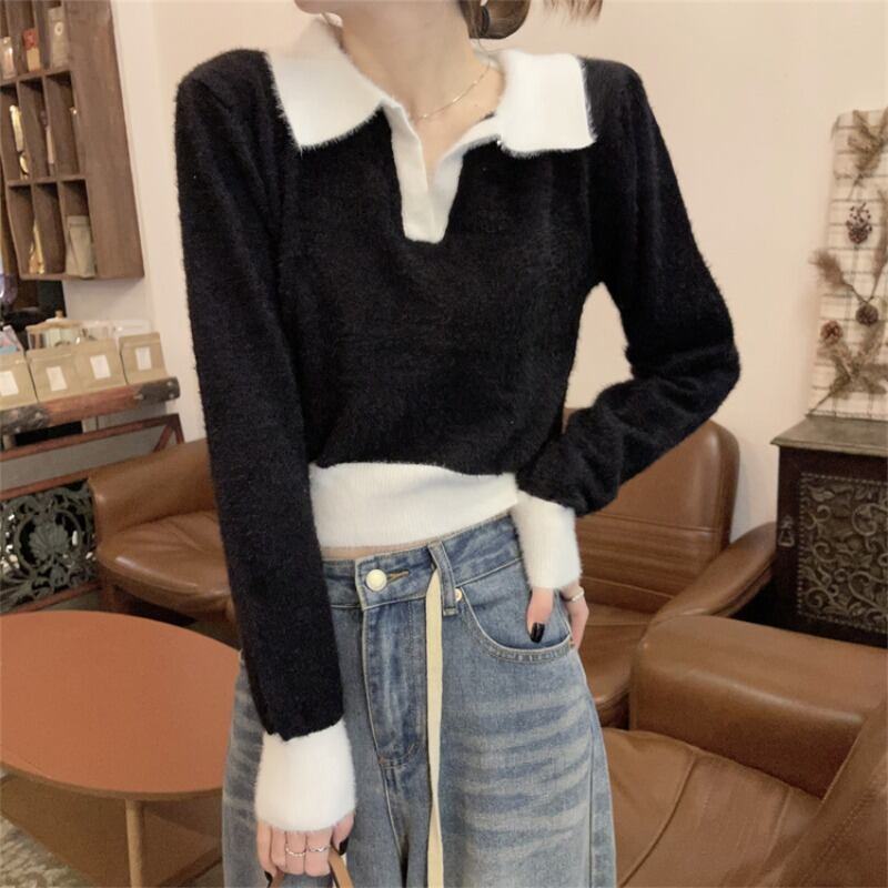 Nomikuma ヒットカラーターンダウン襟ニット女性春セーター因果長袖プルオーバーショートニットトップス ロング スプリング 春物 kor81486155312