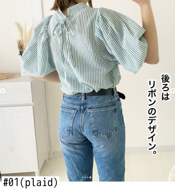 Nomikuma 春夏スウィートブラウストップス女性シックなランタンスリーブ蝶ネクタイ O ネックシャツ因果チェック柄デ リボン 大人ガーリー キュート カジュアル スプリング 春物 サマー 夏物 Oネック kor43555728114