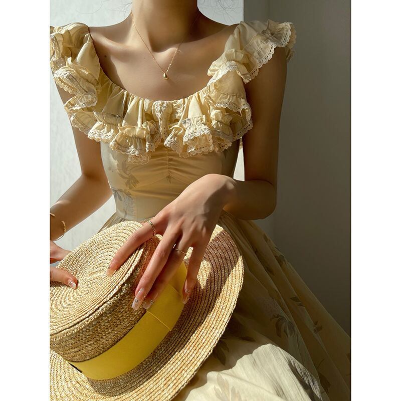 Nomikuma 夏花柄ロングドレスレースフリルパッチワーク O ネックノースリーブ Vestidso 女性ウエスト因果 A ラインドレス サマー 夏物 Oネック Aライン kor50892164514