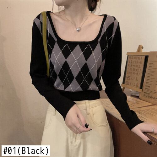 Nomikum アーガイルスクエアカラーニットウェア女性春秋スリムショートセーター長袖ニットトップス ロング スプリング 春物 オータム 秋物 スクウェア kor32171034155
