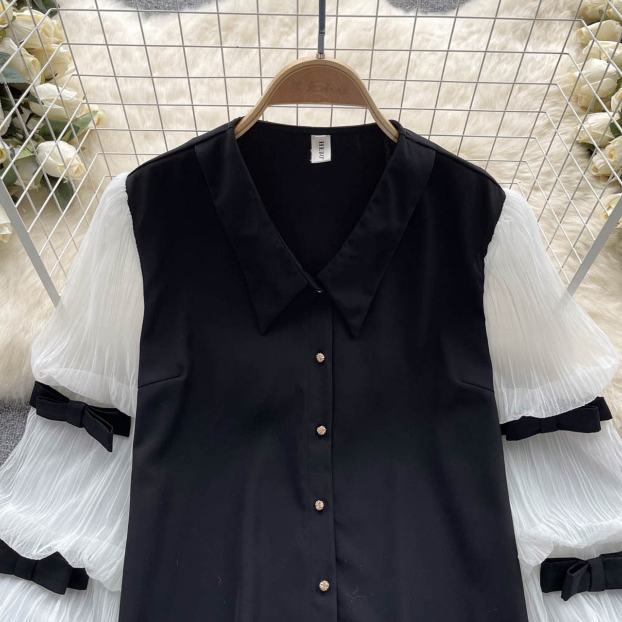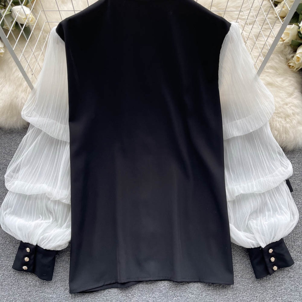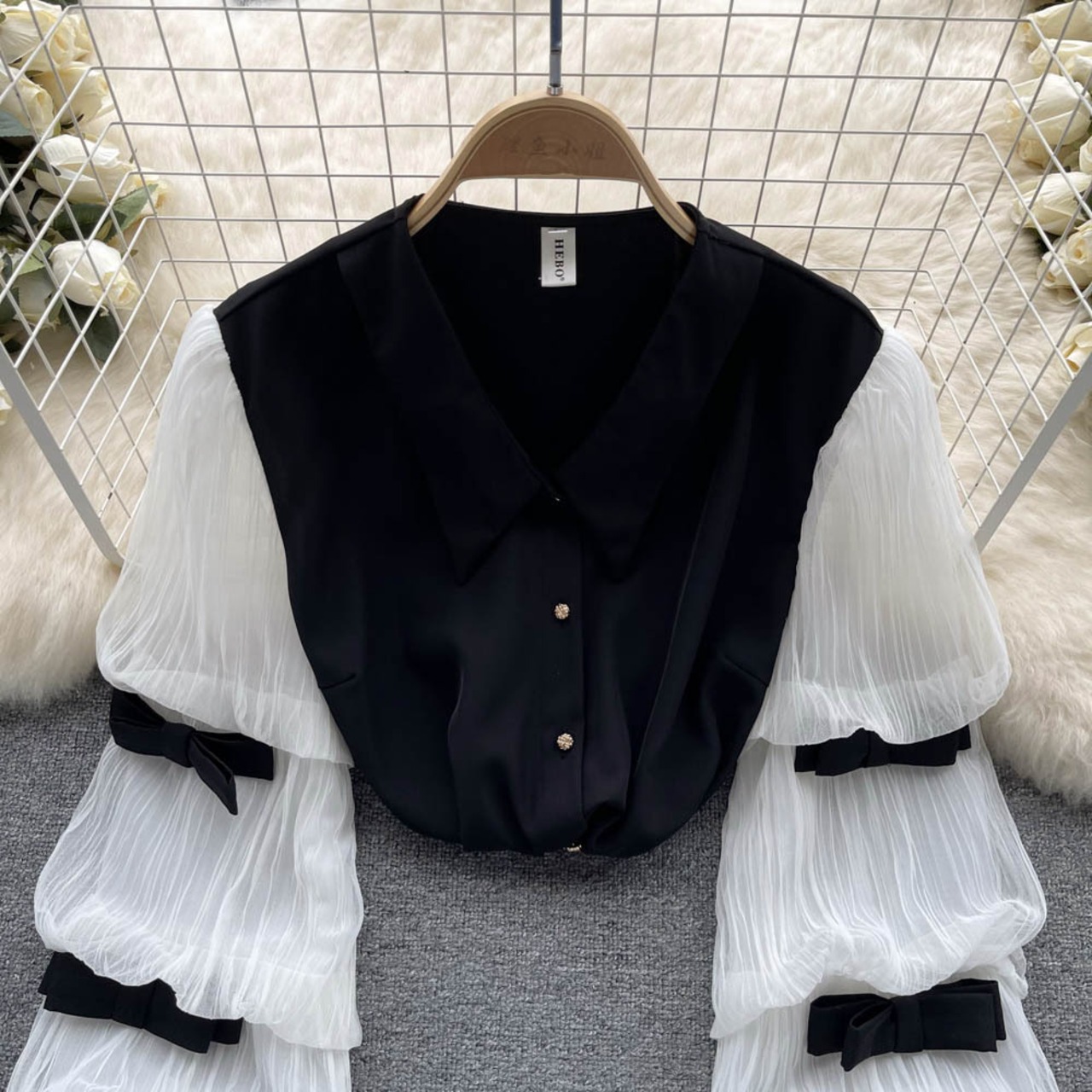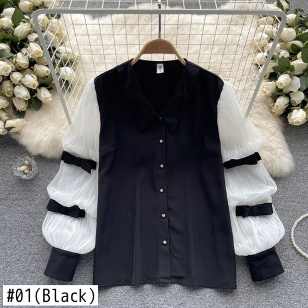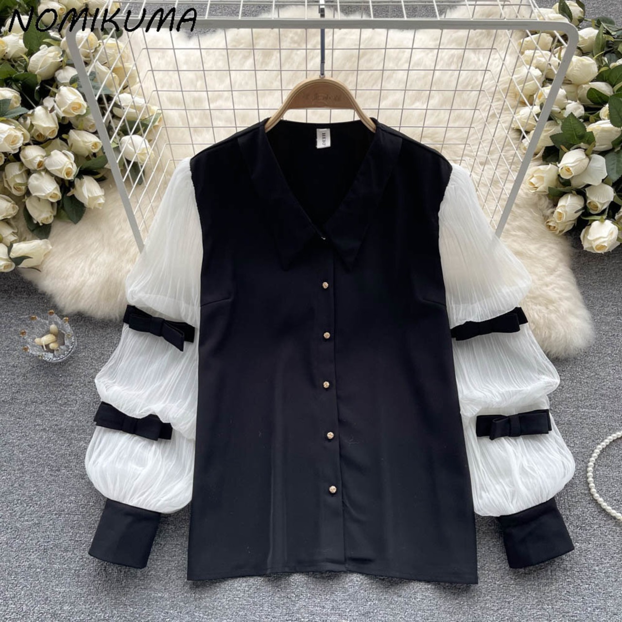 Nomikuma 春ヒットカラーシックなちょう結びパフスリーブパッチワークブラウストップス因果ターンダウン襟女性シャツ リボン スプリング 春物 kor75948073973