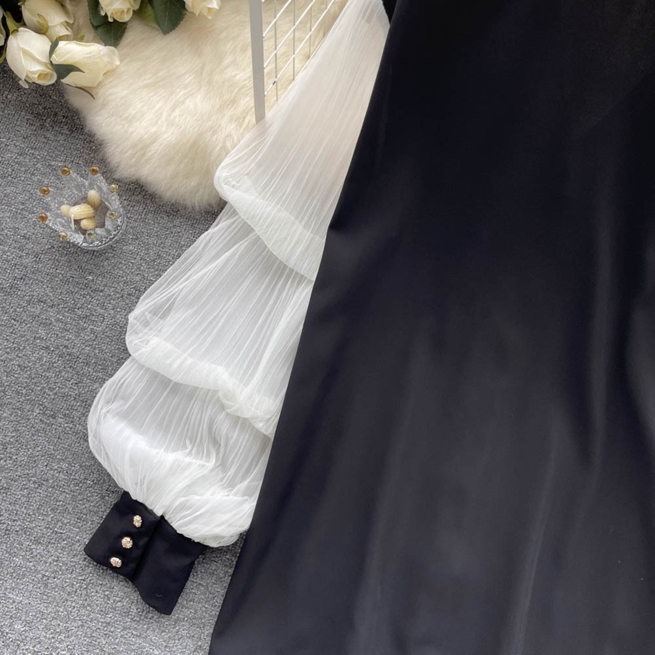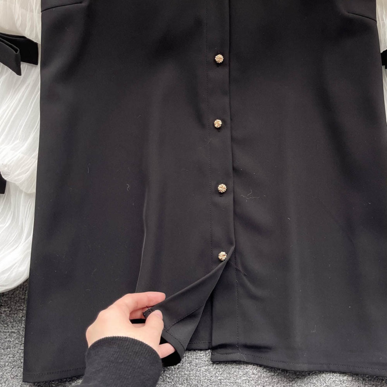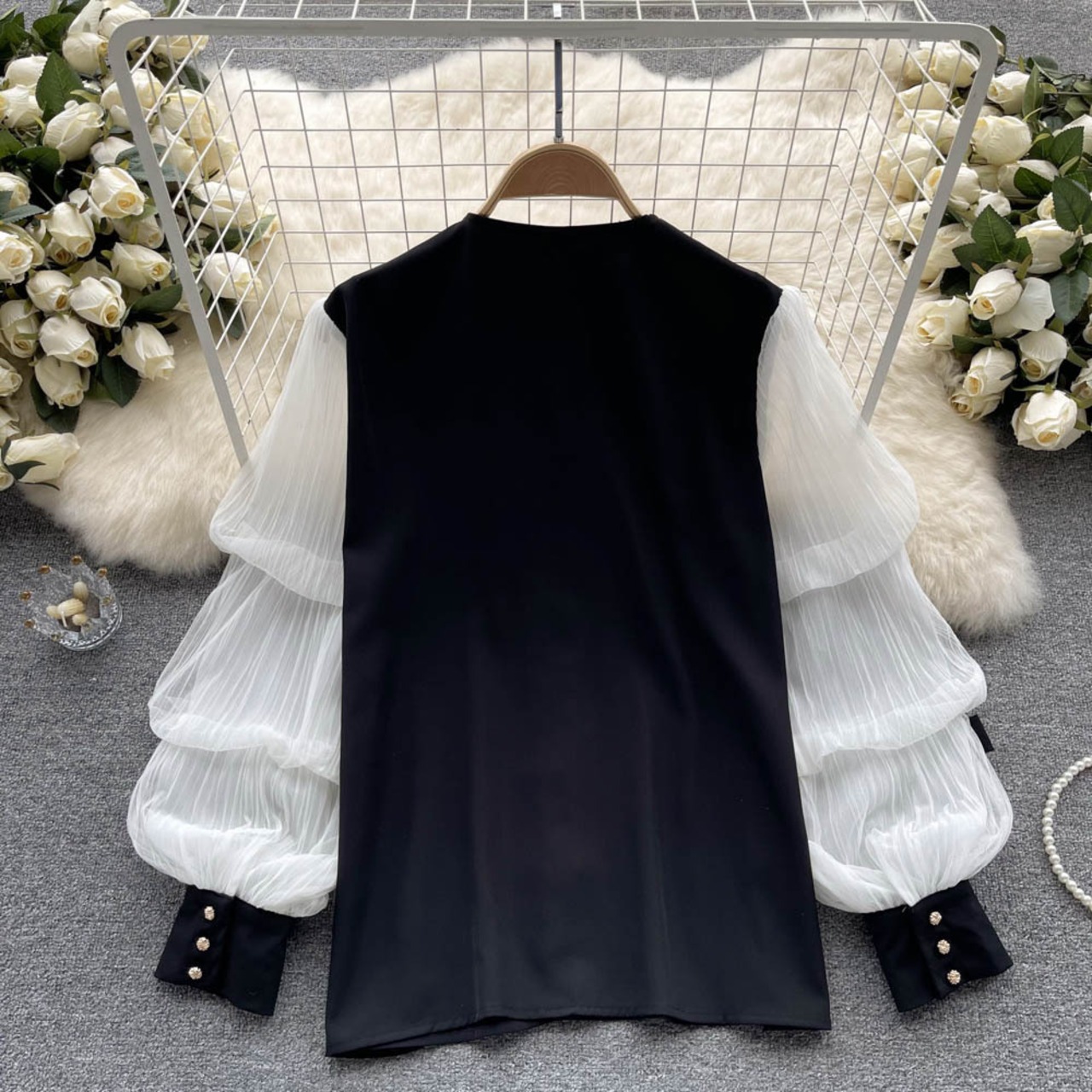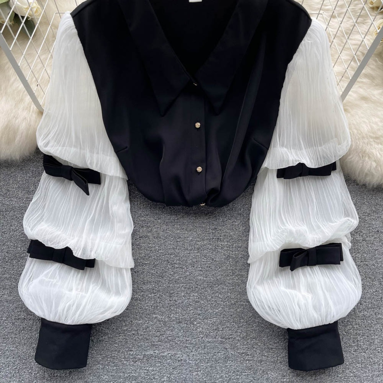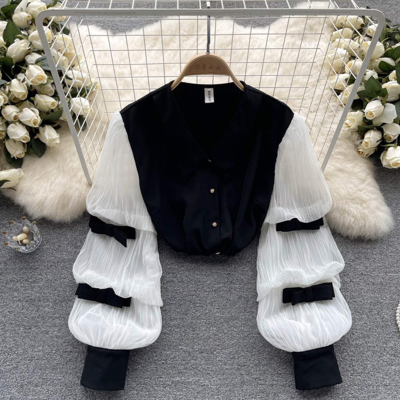 Nomikuma 春ヒットカラーシックなちょう結びパフスリーブパッチワークブラウストップス因果ターンダウン襟女性シャツ リボン スプリング 春物 kor75948073973