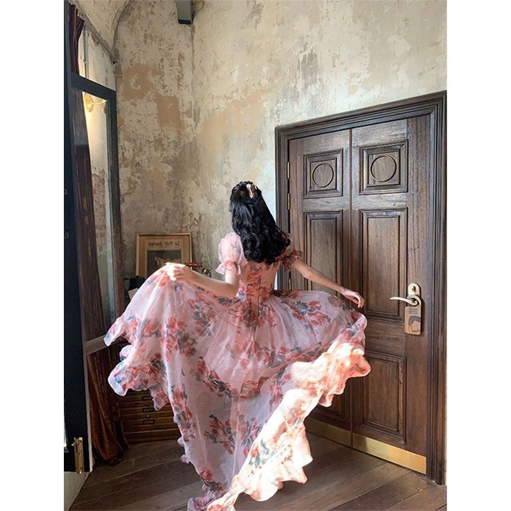 ノミクマ花柄女性ドレス春夏パフスリーブ V ネックドレス不規則なフリル A ラインロングローブ スプリング 春物 サマー 夏物 Vネック Aライン kor70208543289