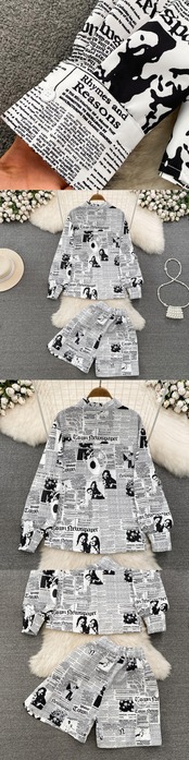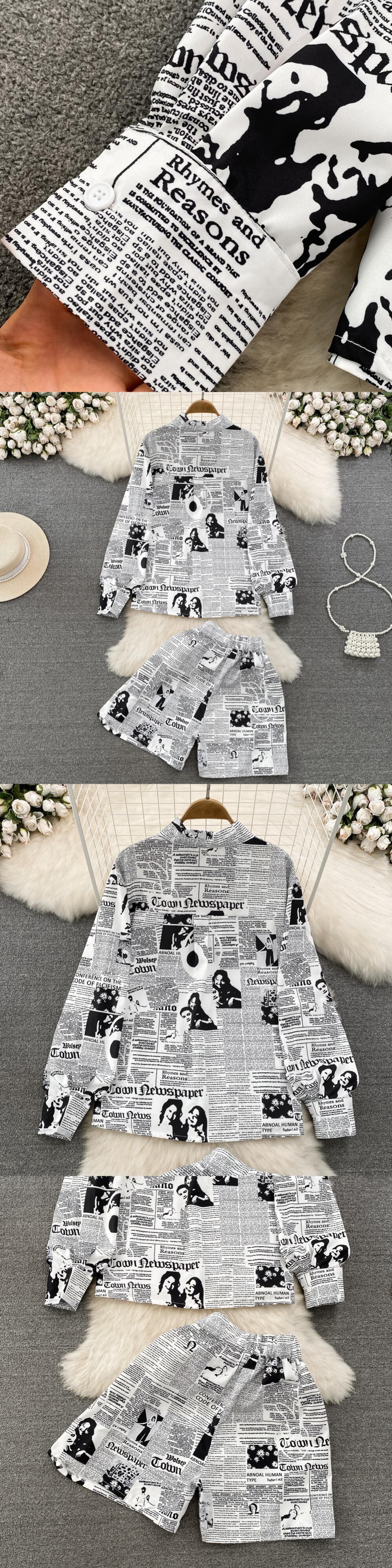 ノミクマセットレディースレタープリント2ピースロングスリーブターンダウンカラーブラウス+ウエストワイドレッグショーツ 長袖 ブルマー ワイドパンツ kor2581377560