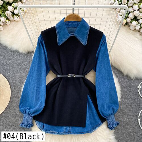 Nomikuma 春秋二枚トップセット女性長袖ターンダウン襟ジーンズトップ + ベルトスリムウエストセーターチョッキ ロング スプリング 春物 オータム 秋物 ハーネス kor24077149804