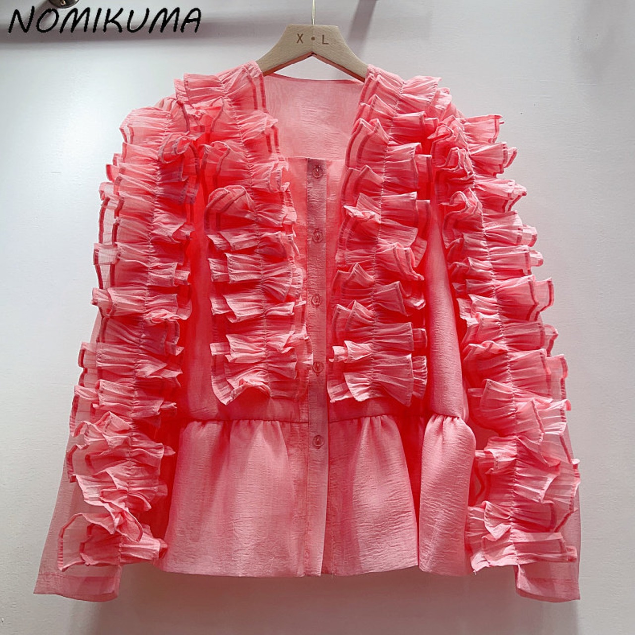 Nomikuma シックフォールド フリル パッチワーク ブラウス シャツ シングル ブレスト 長袖 V ネック レディース トップス 春 ロング スプリング 春物 Vネック kor95141960168