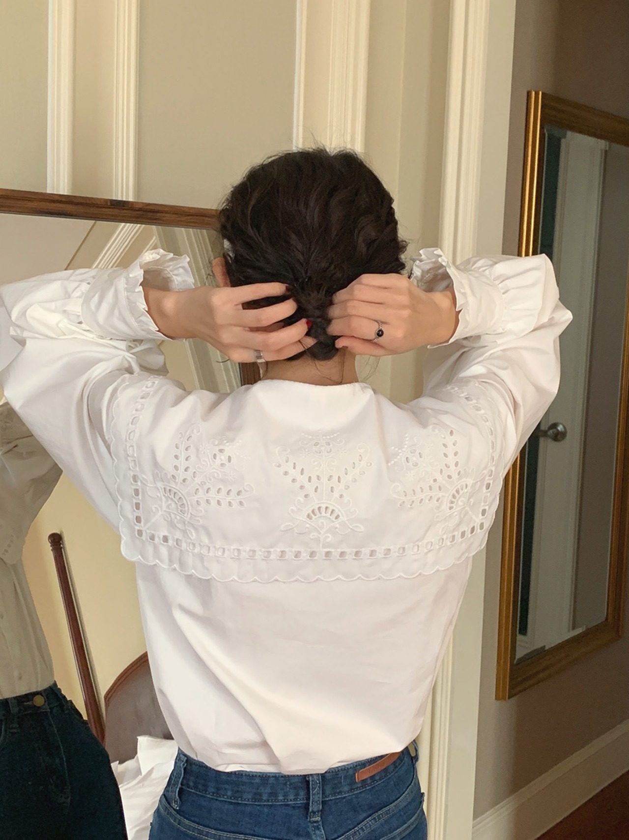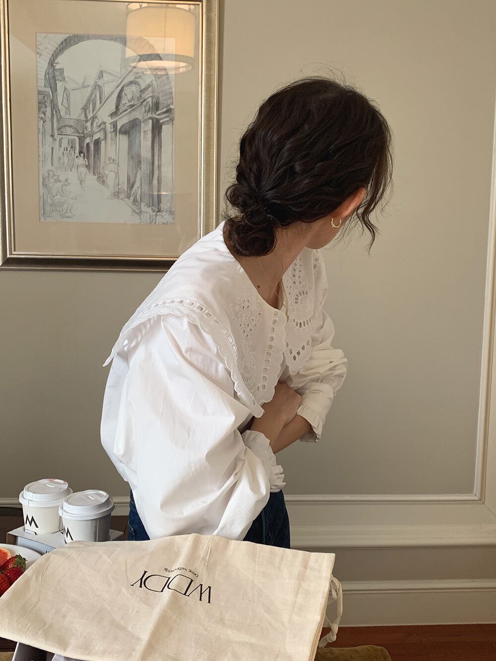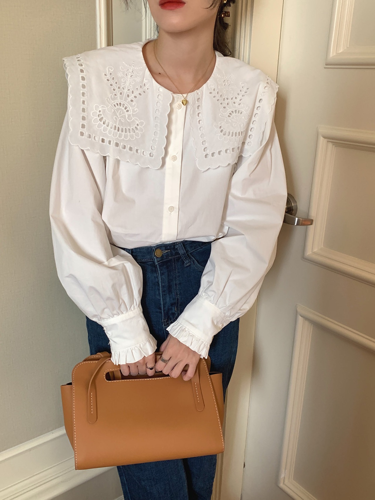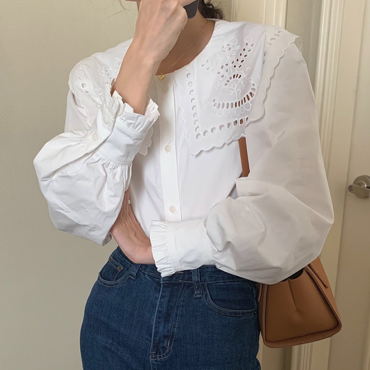 Nomikuma シックな中空アウト ターンダウン襟ブラウス トップス春パフ スリーブ女性シャツ因果デ スプリング 春物 kor42512761652
