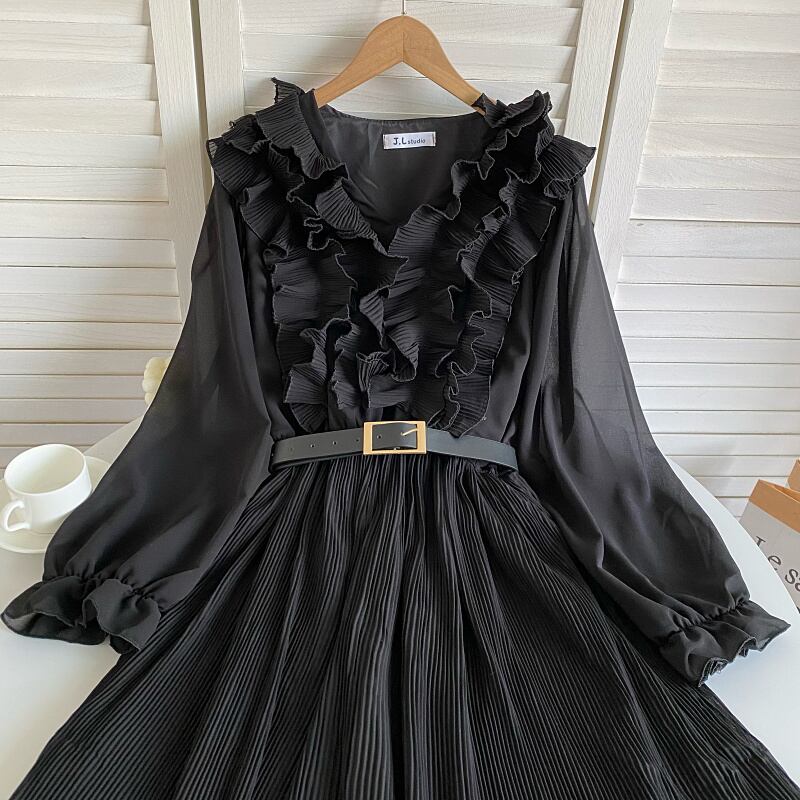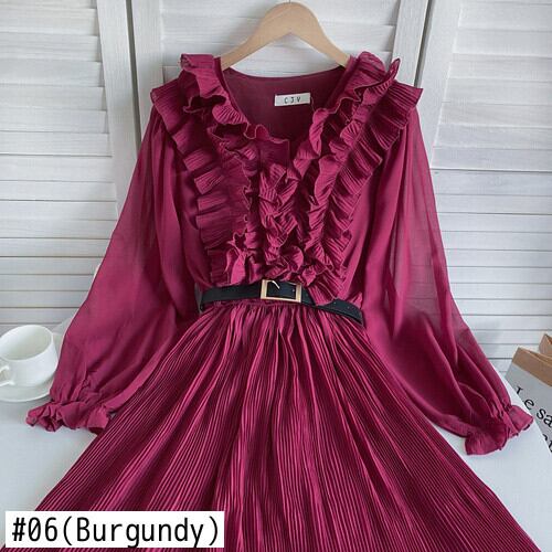 Nomikuma V ベック フリル パフ長袖ドレス女性ベルト スリム ウエスト因果 A ライン プリーツ ドレス Vestidos ロング ハーネス Aライン kor19195667287